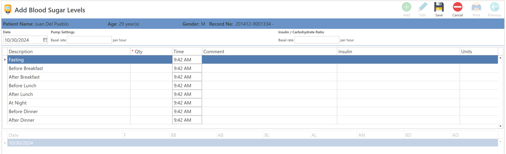 - Add: Record the value, time administered, insulin type, and number of units.