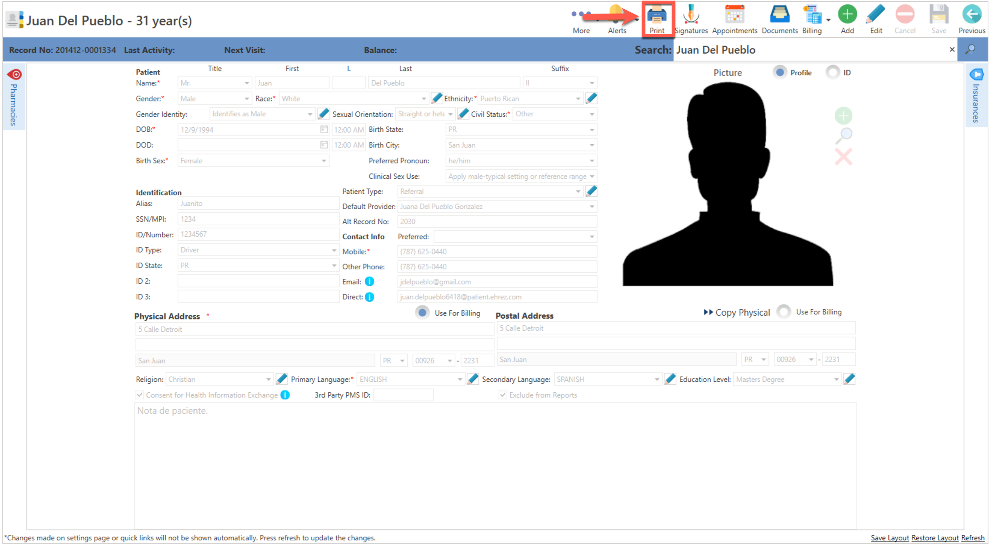 Sección para imprimir, el reporte demográfico del paciente.