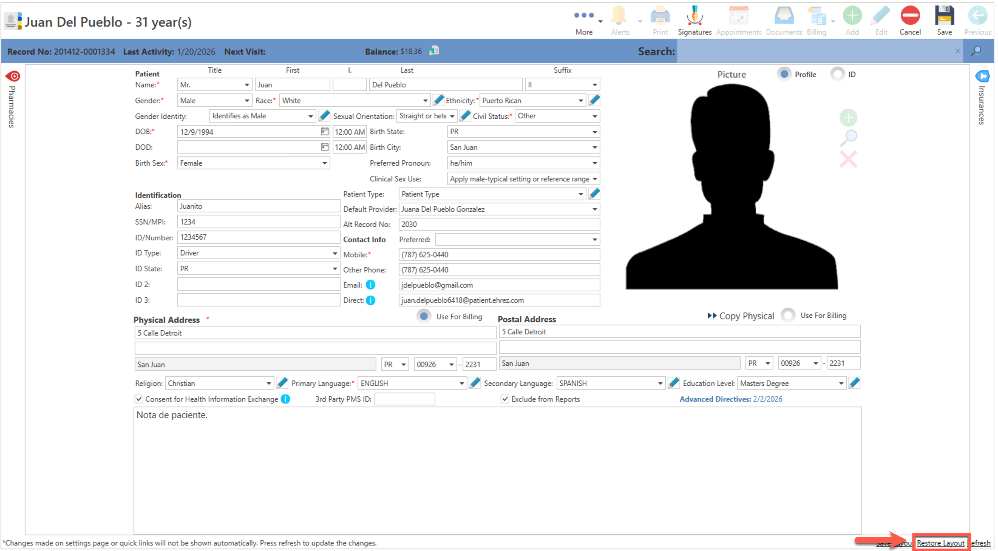 - Si desea regresar al diseño original de la pantalla, presione el enlace de "Restore Layout", localizado en la parte inferior de la pantalla.