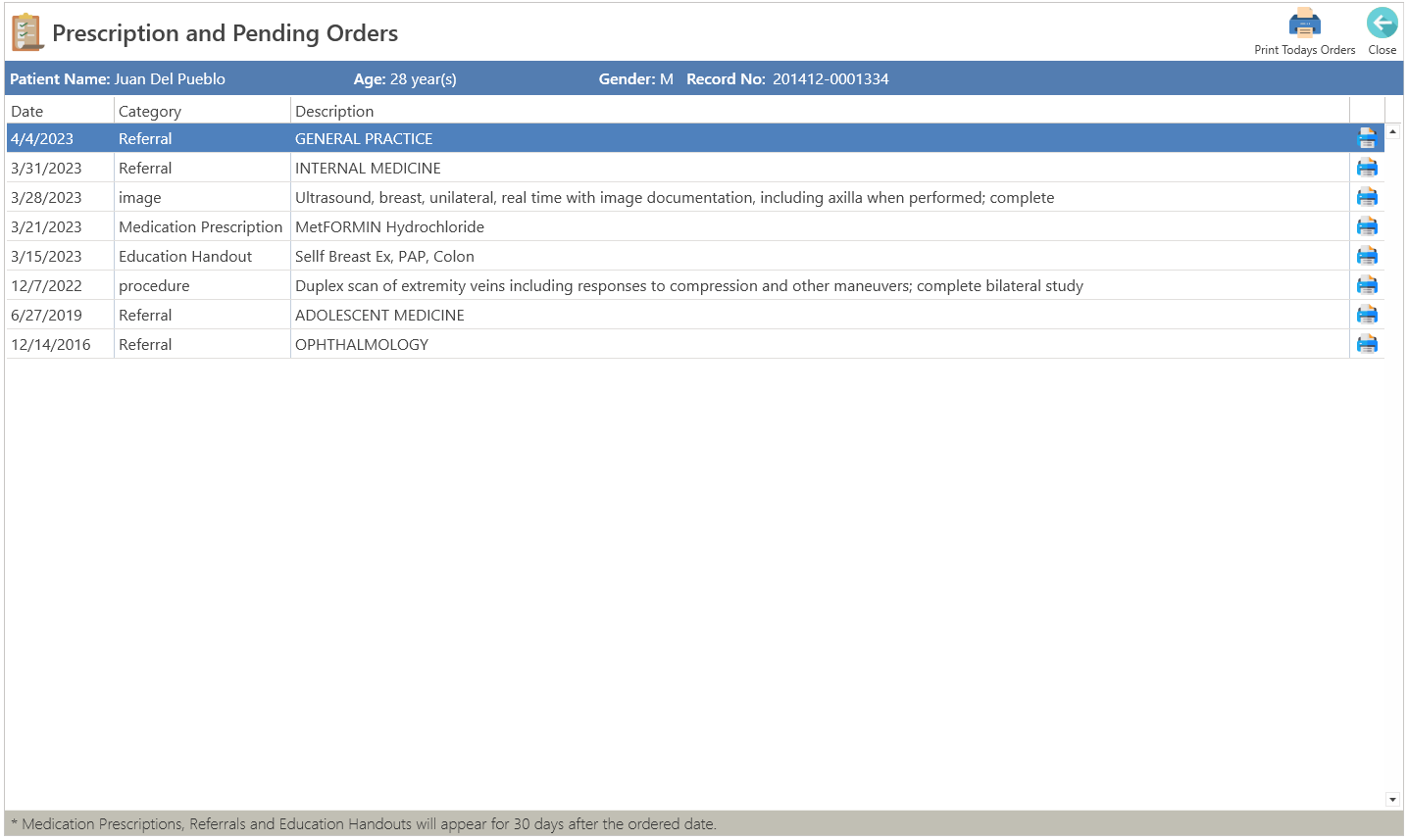 - Print Todays Orders: Enables printing of the orders sent to a patient on the current day.