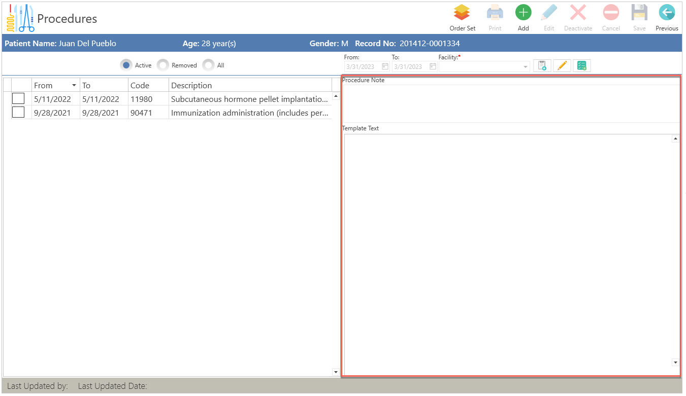 Grid: Place where all the procedures performed on the patient will be displayed.