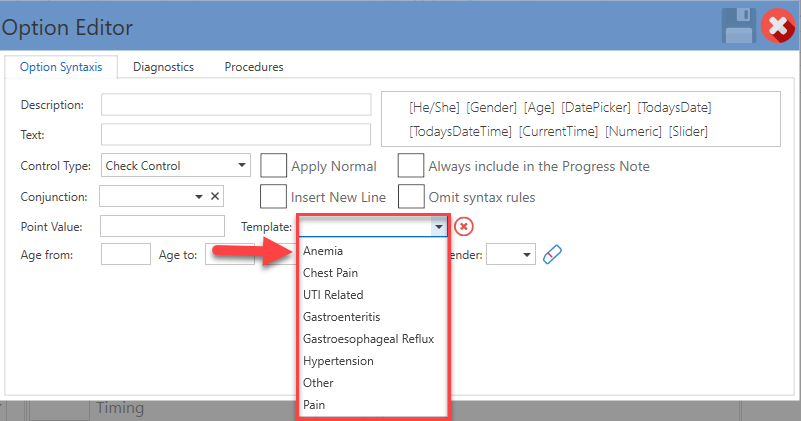 - Press the Clinical button and select the Clinical Symptoms Templates button.