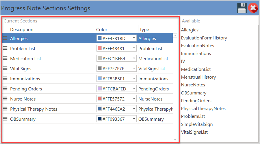 - Color: This column enables the configuration of colors for the sections within the Advanced Progress Note screen, facilitating the identification of each section.