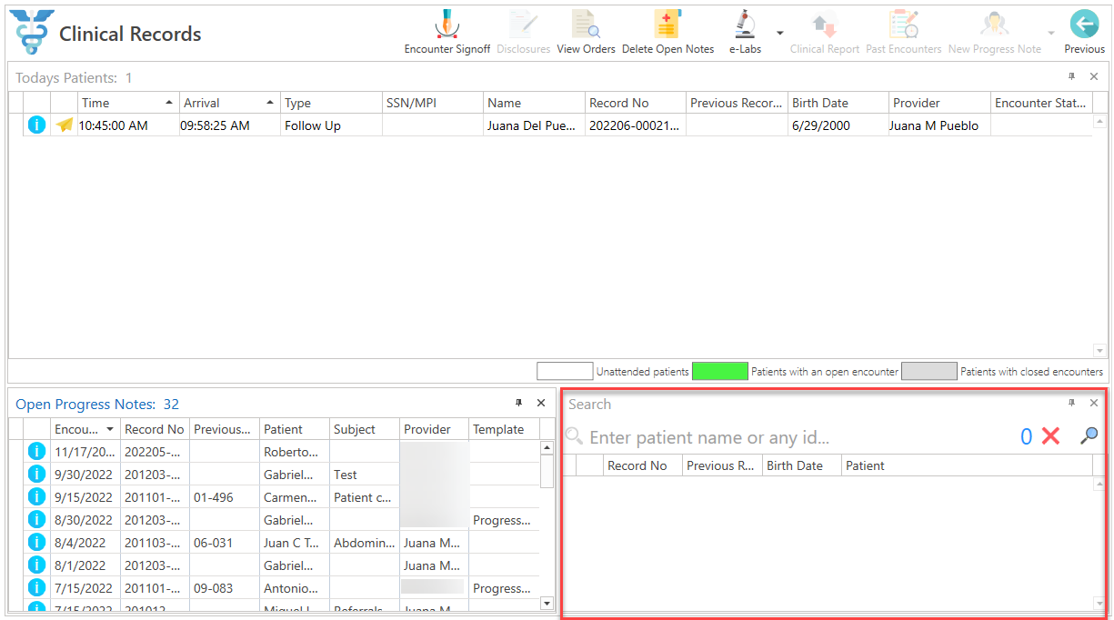 - Patients with an open encounter: If the patient, in the Todays Patients section, is identified with green color, it means that the progress note is open.