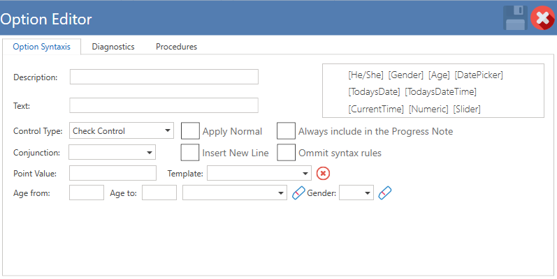 - Save: Guarda las opciones seleccionadas en la nota de progreso y las copia en la sección de "Clinical Evaluation" en la pantalla de "Advanced Progress Note".