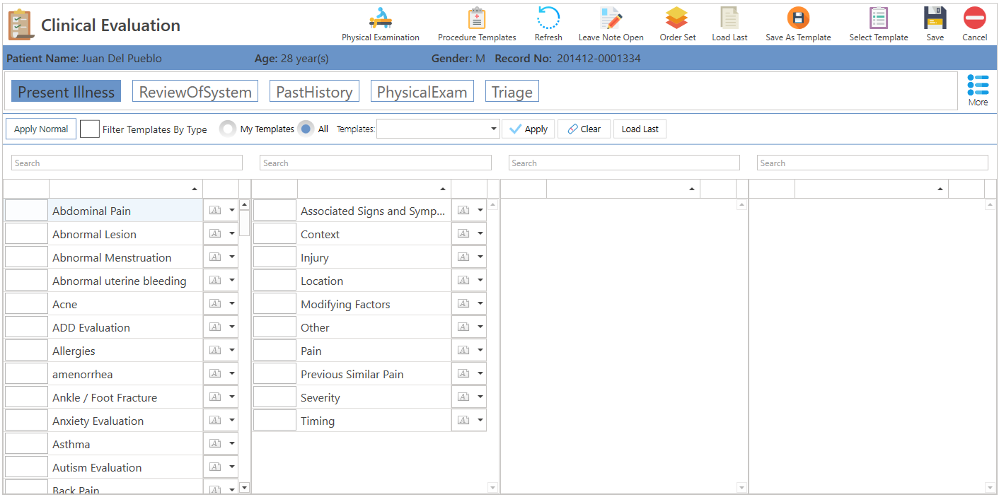 - Templates: Permite seleccionar un "Template", para la evaluación del paciente.