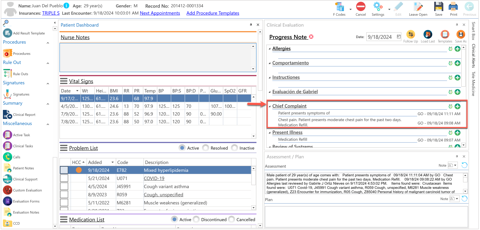 La información que se guarde en esta pestaña, se estará desplegando en la pantalla de "Advanced Progress Note", en la sección de "Clinical Evaluation / Chief Complaint".
