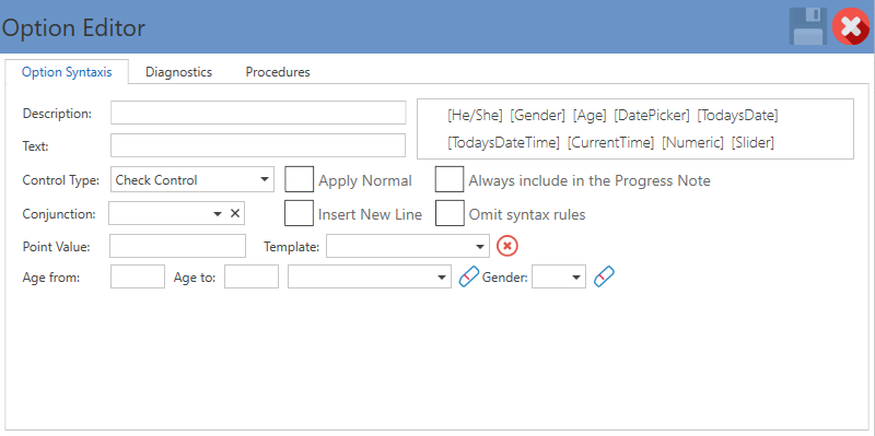 - Save: Guarda las opciones seleccionadas a la nota de progreso y las copia a la sección de "Clinical Evaluation", en la pantalla de "Advanced Progress Note".