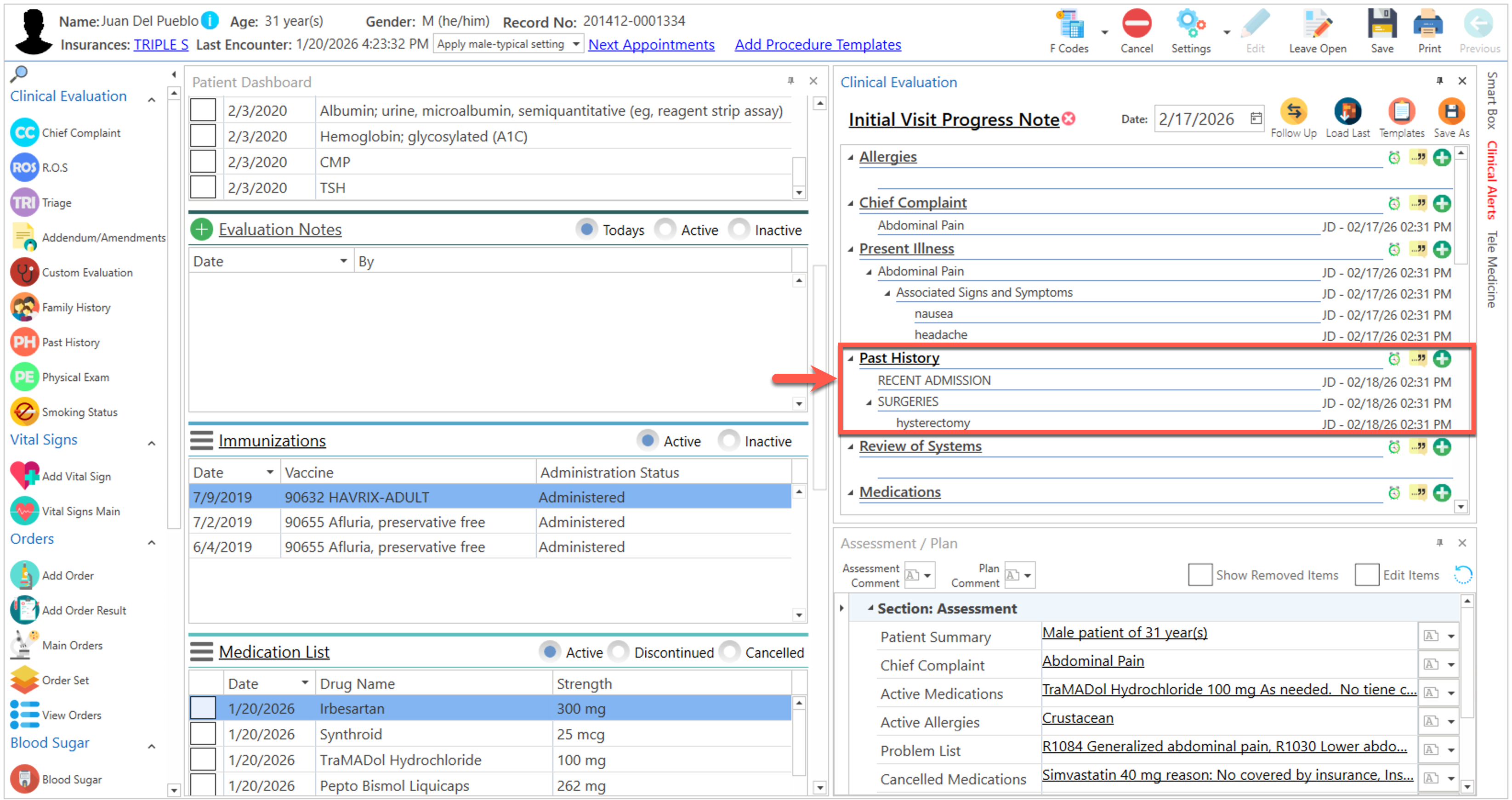 La información que se guarde en esta pestaña, se estará desplegando en la pantalla de "Advanced Progress Note", en la sección de "Clinical Evaluation / Past History". (Nota: Para que se despliegue el historial pasado del paciente, deberá seleccionar el encasillado de "Include All Past History in Progress Note".)