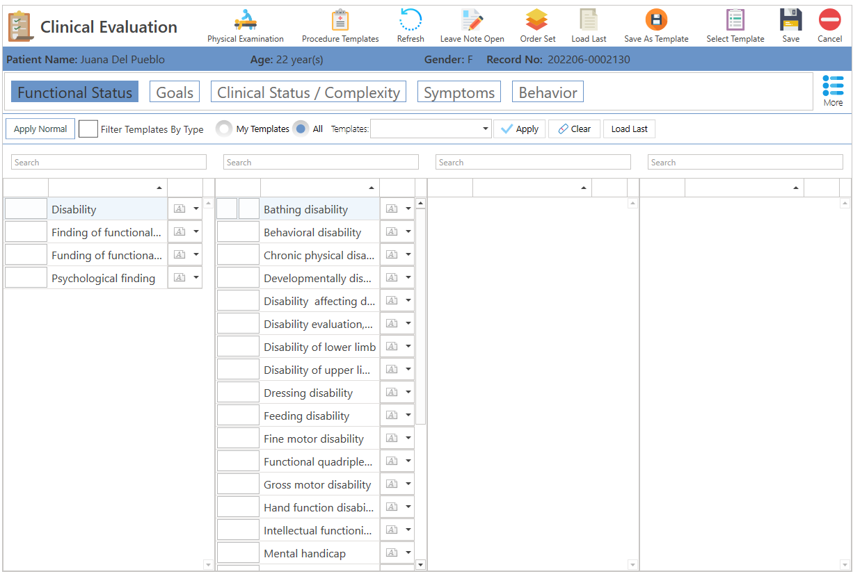 - Save: Save the selected option in the progress note and copy them to the Clinical Evaluation section of the Advanced Progress Note screen.
