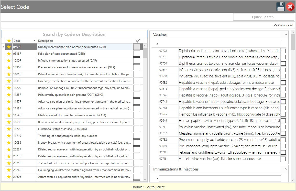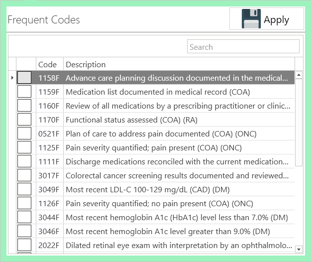 • New Visit: Display the office codes; pressing them will copy the codes to the Encounter Procedures section. The user will have the option to configure which codes are displayed in this section.