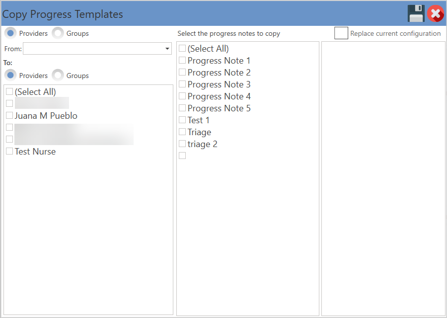 - Copy Templates: Allows you to copy a configuration of a template, progress note from one supplier to another or from one group to another.