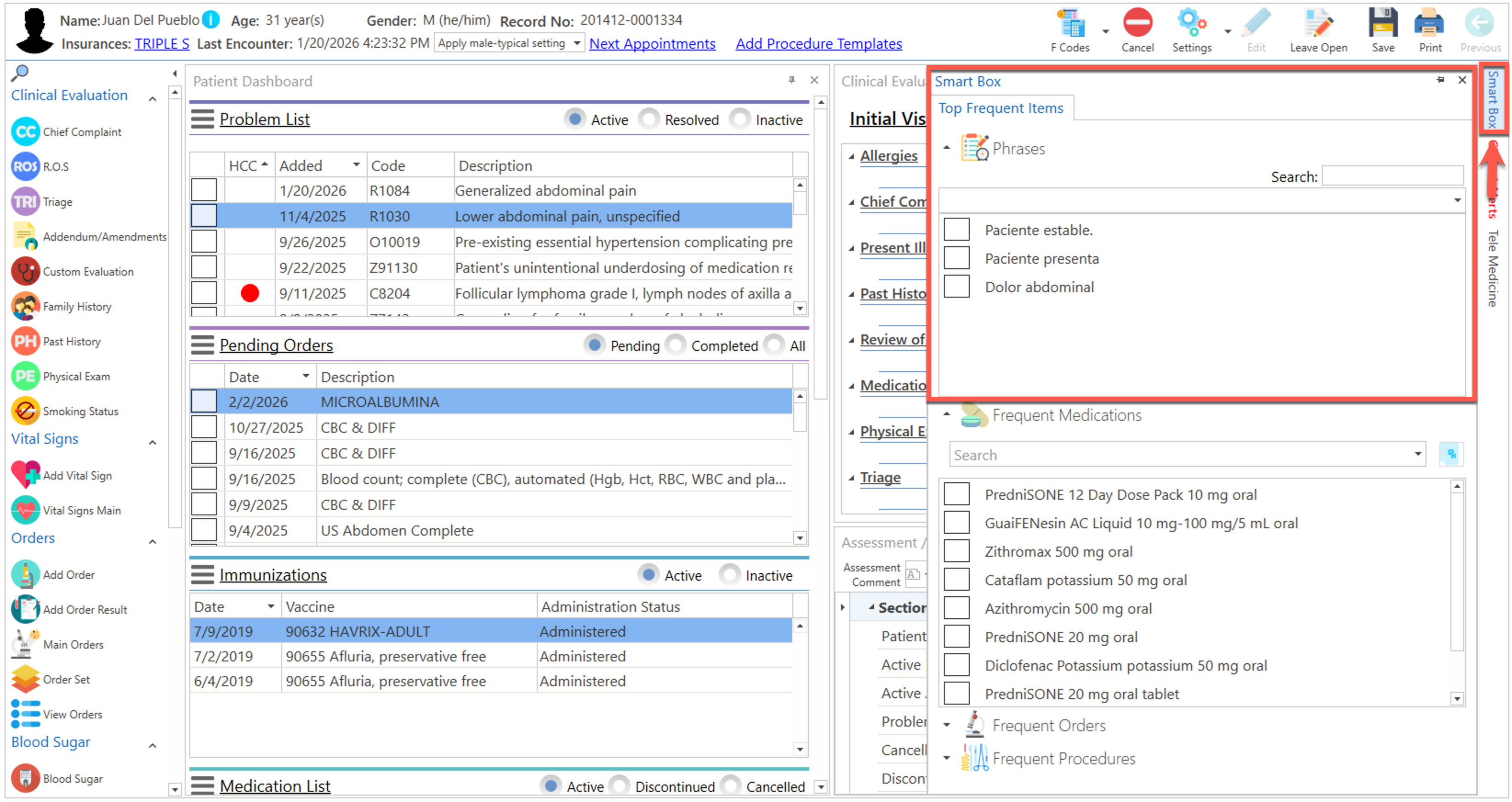 En la pantalla de "Advanced Progress Note", presione la pestaña de "Smart Box", localizado en la parte derecha de la pantalla. de la sección de "Clinical Evaluation".