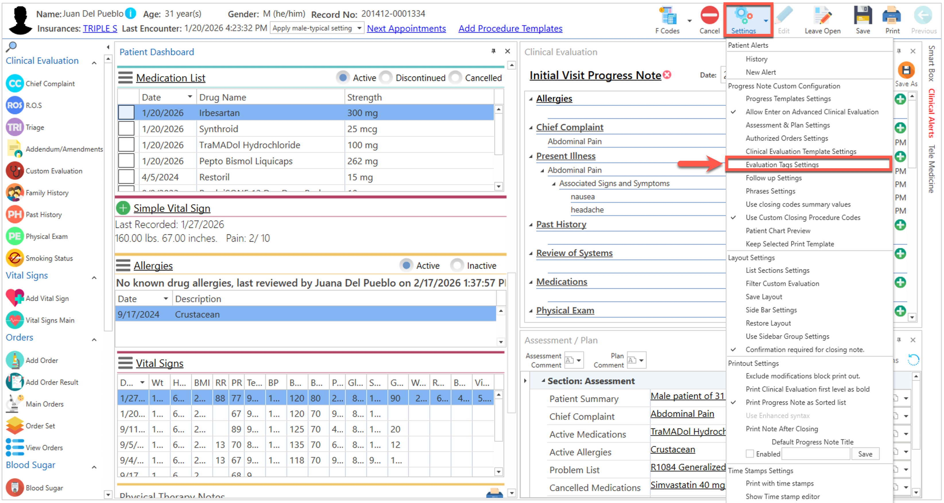- Conociendo el área de: Advanced Progress Note / Settings / Evaluation Tags Settings