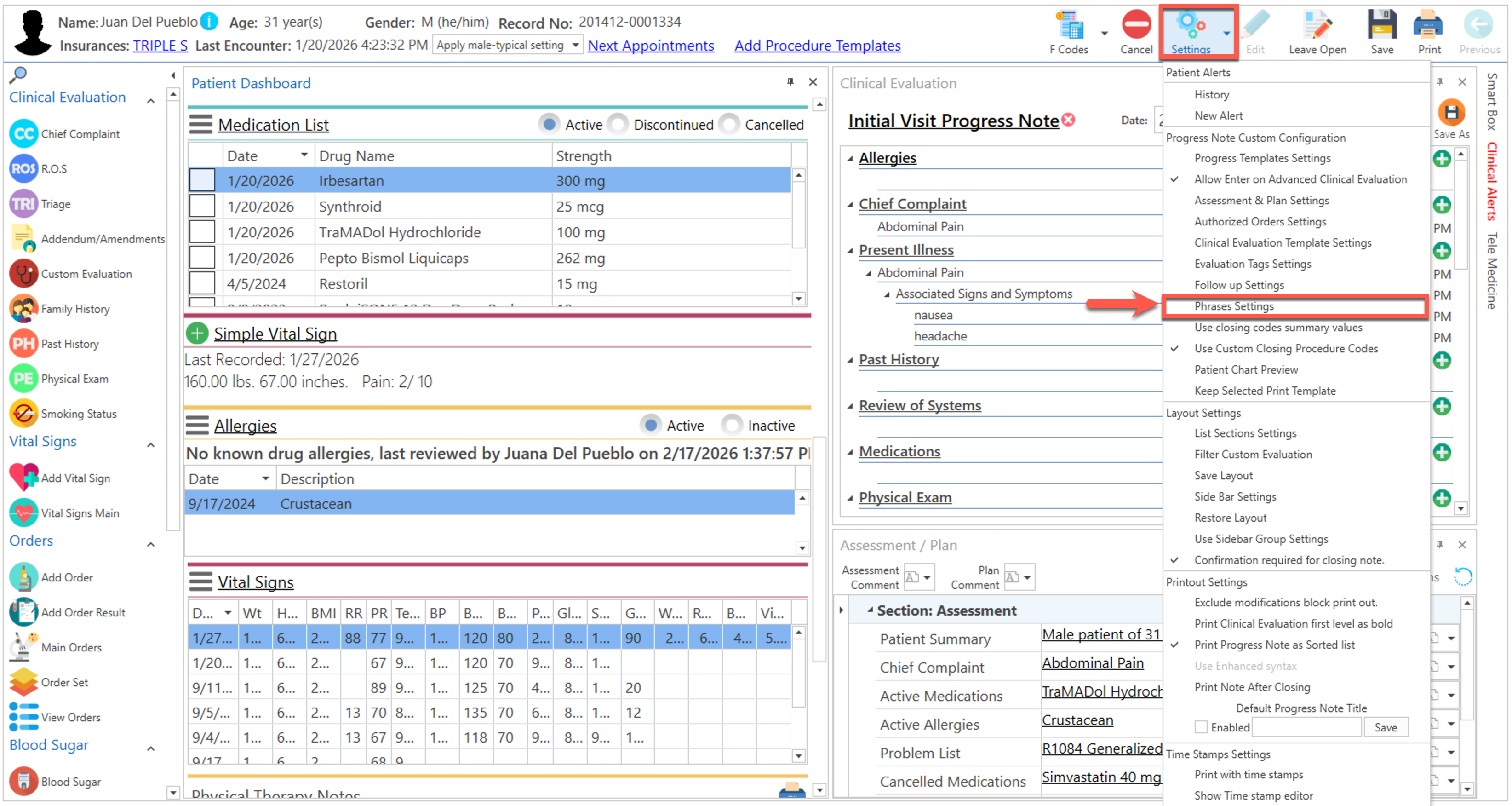- Conociendo el área de: Advanced Progress Note / Settings / Phrases Settings