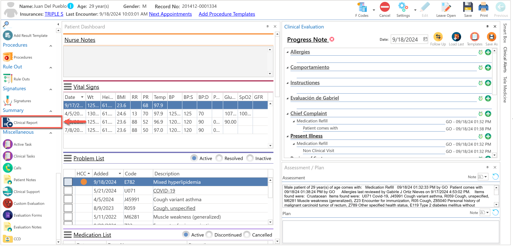 - Presione el botón de "Clinical Report", localizado en la sección del "Side Bar".