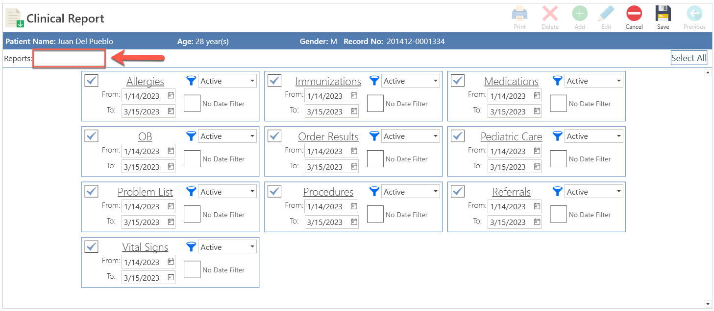 Existen varias opciones, para crear un reporte clínico desde la pantalla de "Clinical Records".
