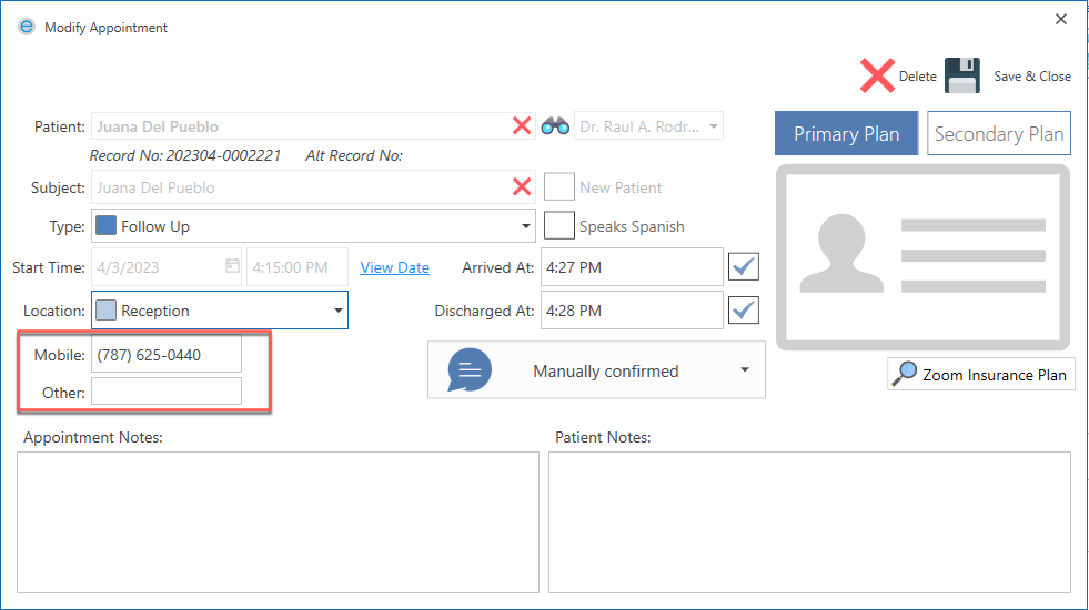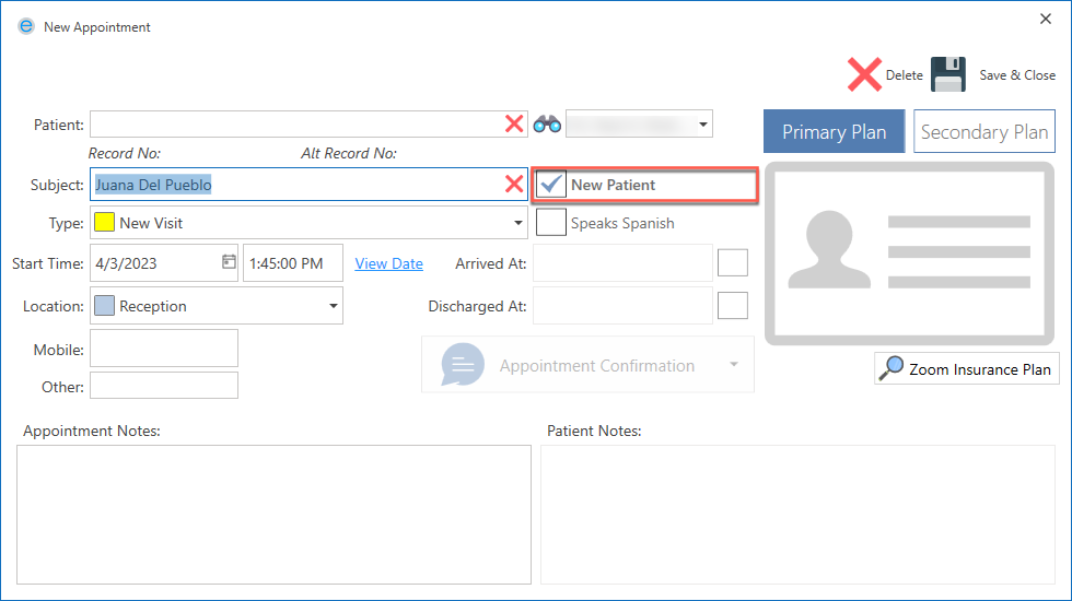 When a patient with a record number is added, the Type field will automatically display as Follow Up.