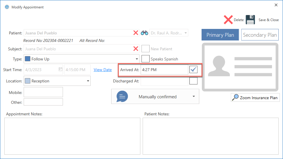 To mark the patient's arrival at the office, choose the Arrived At option.