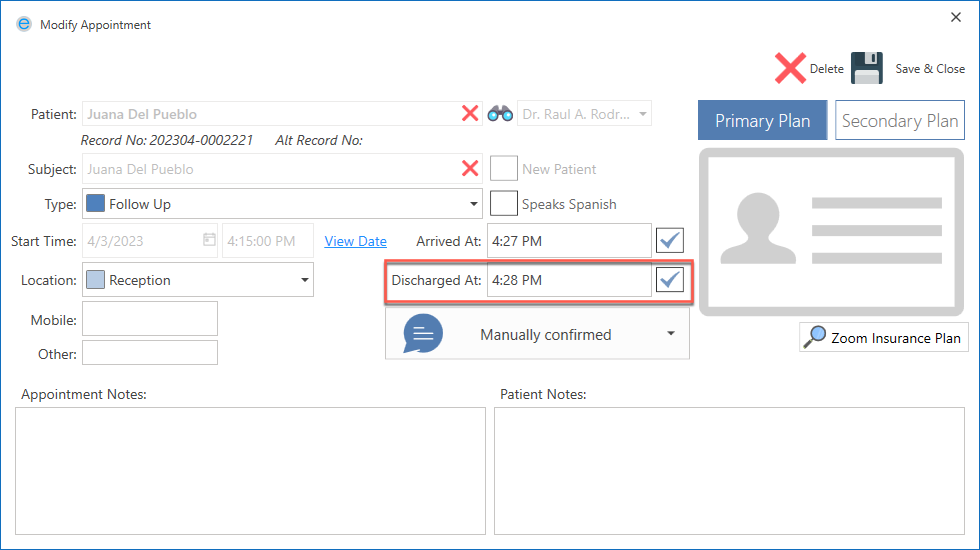 If the patient has left the office, please select the Discharged At option.