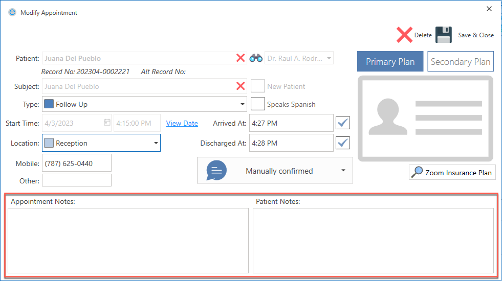 Users may enter a note pertaining to the appointment in the designated Appointment Notes field.