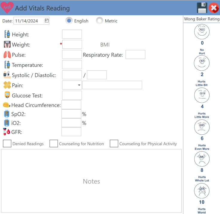 - English or Metric: Allows you to select the format of the vital signs reading of your choice.