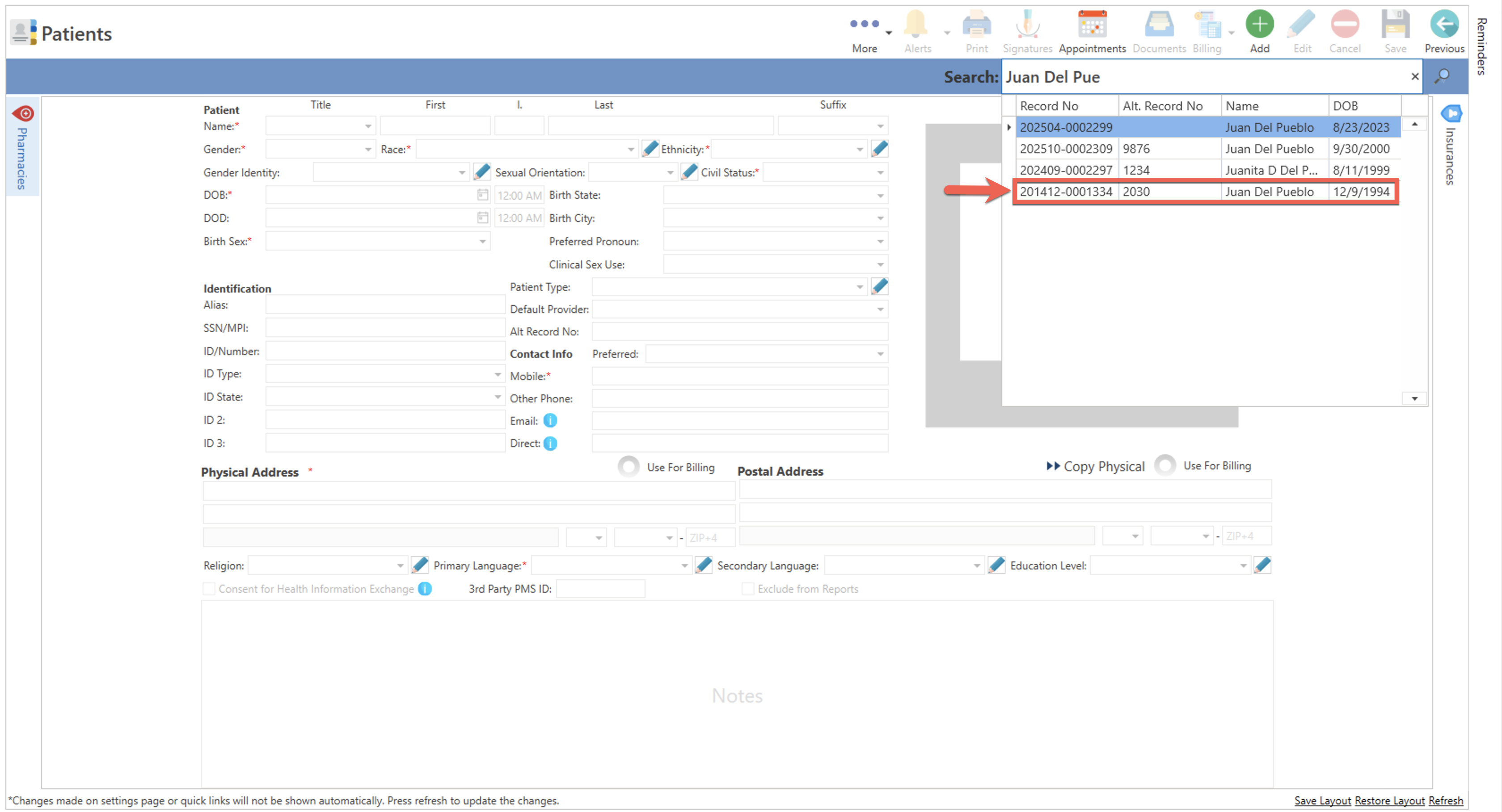 Hay varias opciones para editar el récord del paciente.
