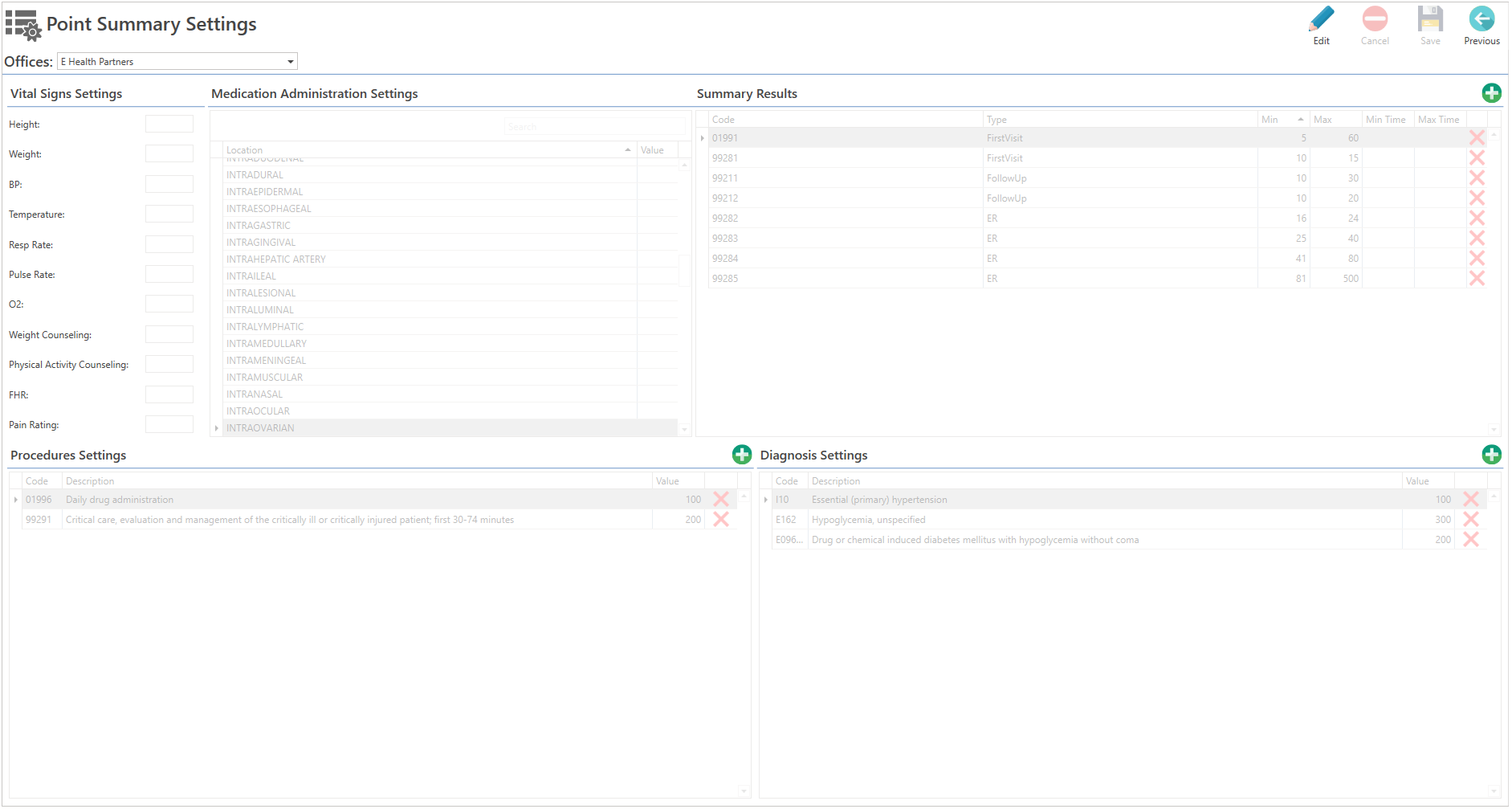 - Medication Administration Settings: Permite configurar los puntos, en la sección de los medicamentos administrados.