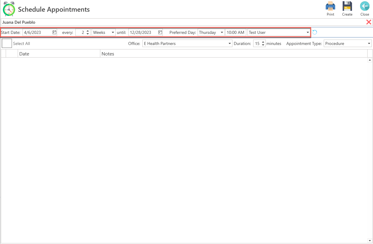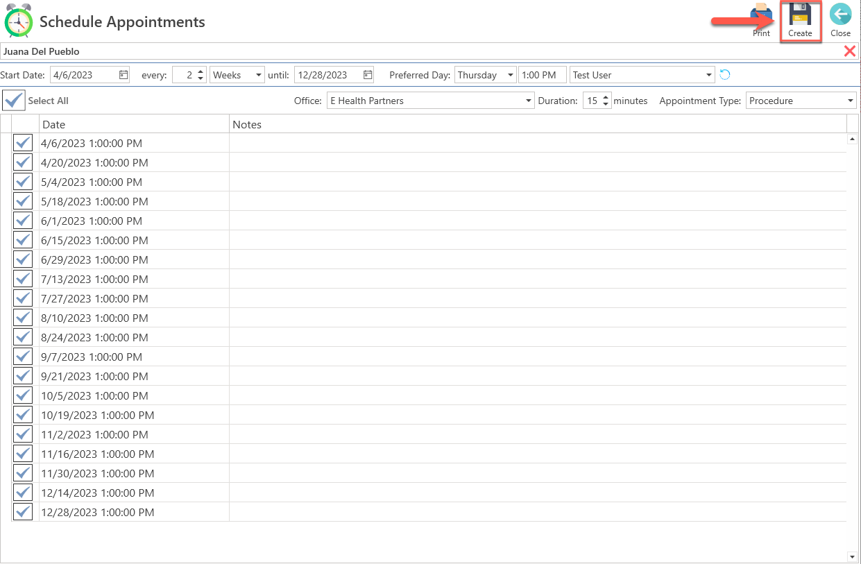 - Select all appointments you wish to create for the patient or select the Select All option to choose all available appointments.