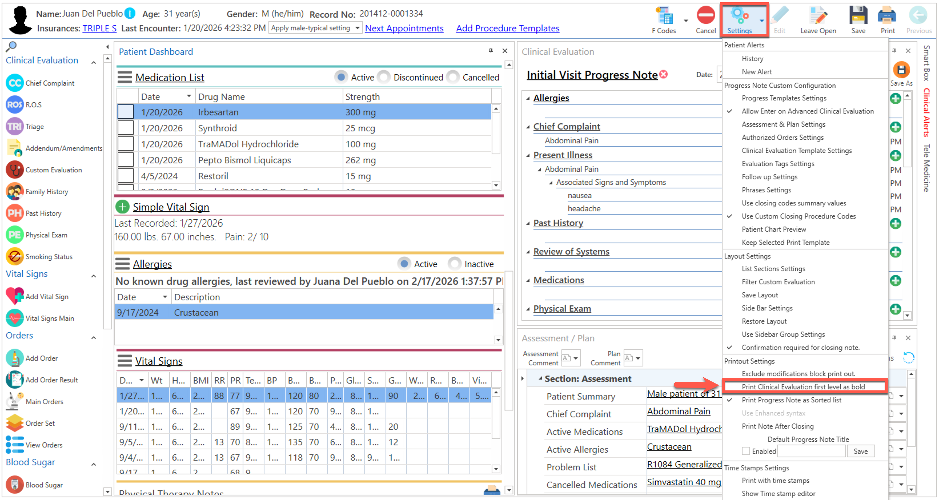 - Preguntas Frecuentes: Advanced Progress Notes / Settings / Print Clinical Evaluation first level as bold