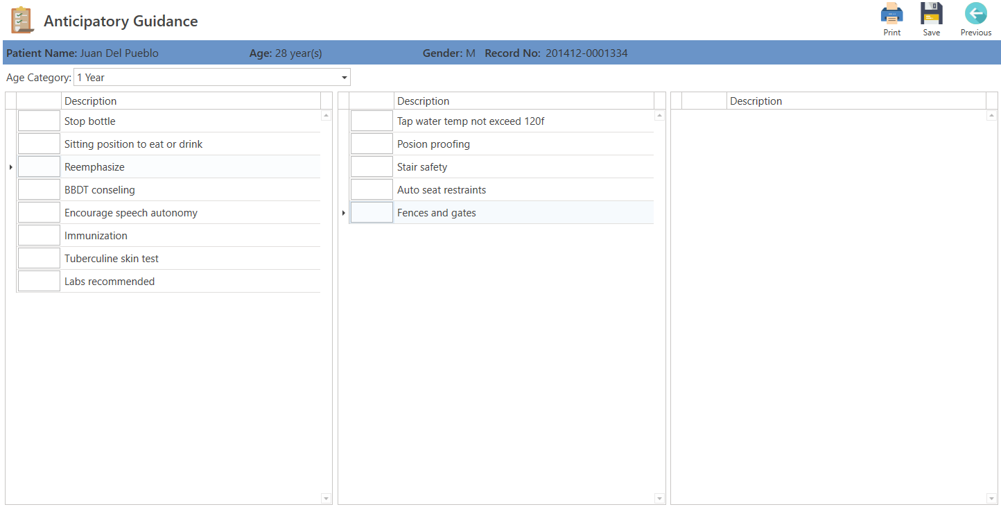 - Print: Enables the printing of the anticipatory guidance document provided to parents of pediatric patients.