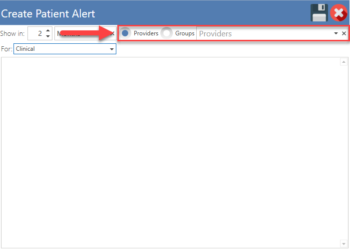 - Seleccione si desea que la alerta se despliegue a un proveedor o grupo específico. Si desea que la alerta se despliegue para todo los usuarios, no seleccione ninguna de las opciones anteriores.