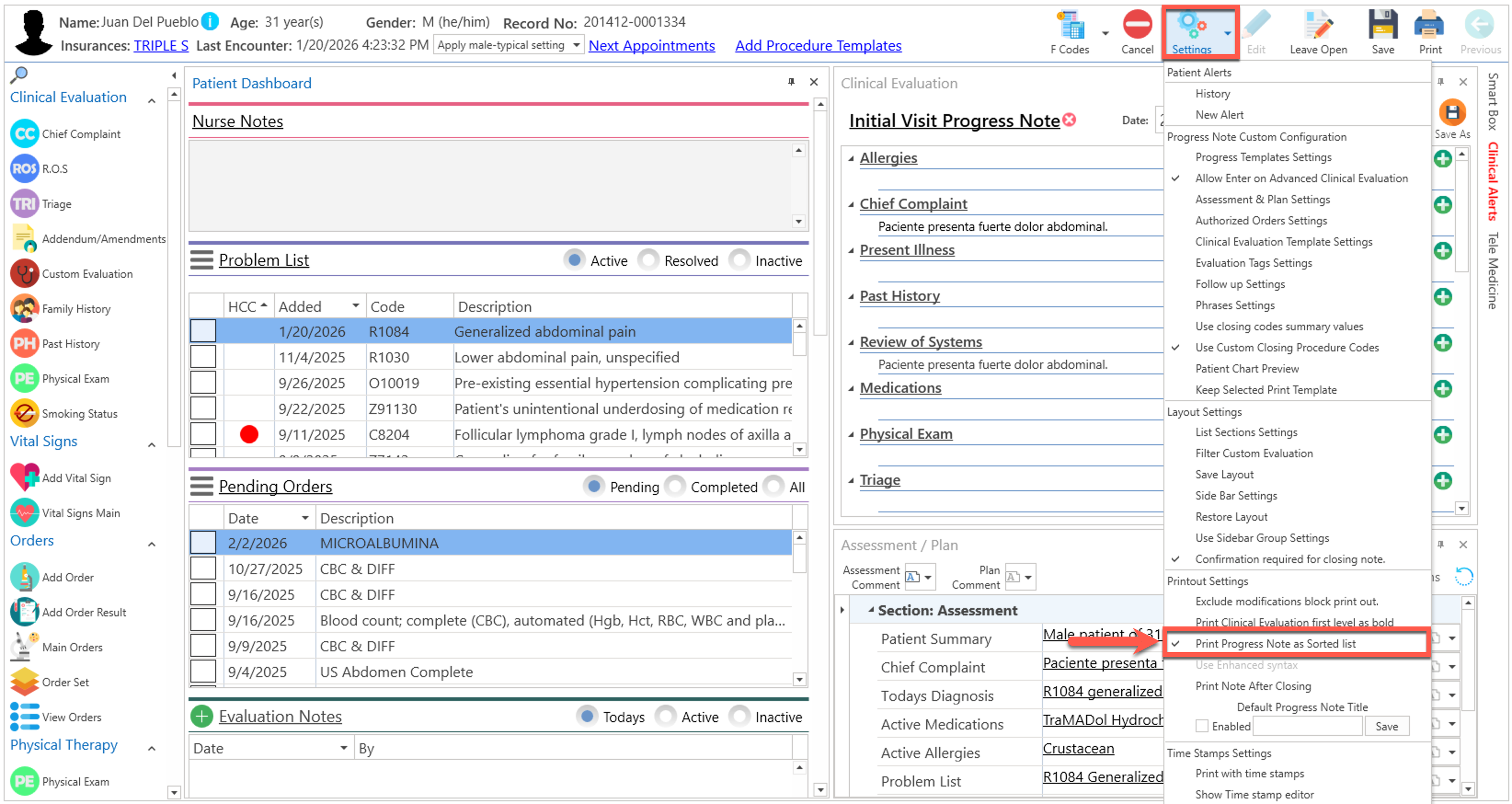 - Conociendo el área de: Advanced Progress Note / Settings / Print Progress Note as sorted list