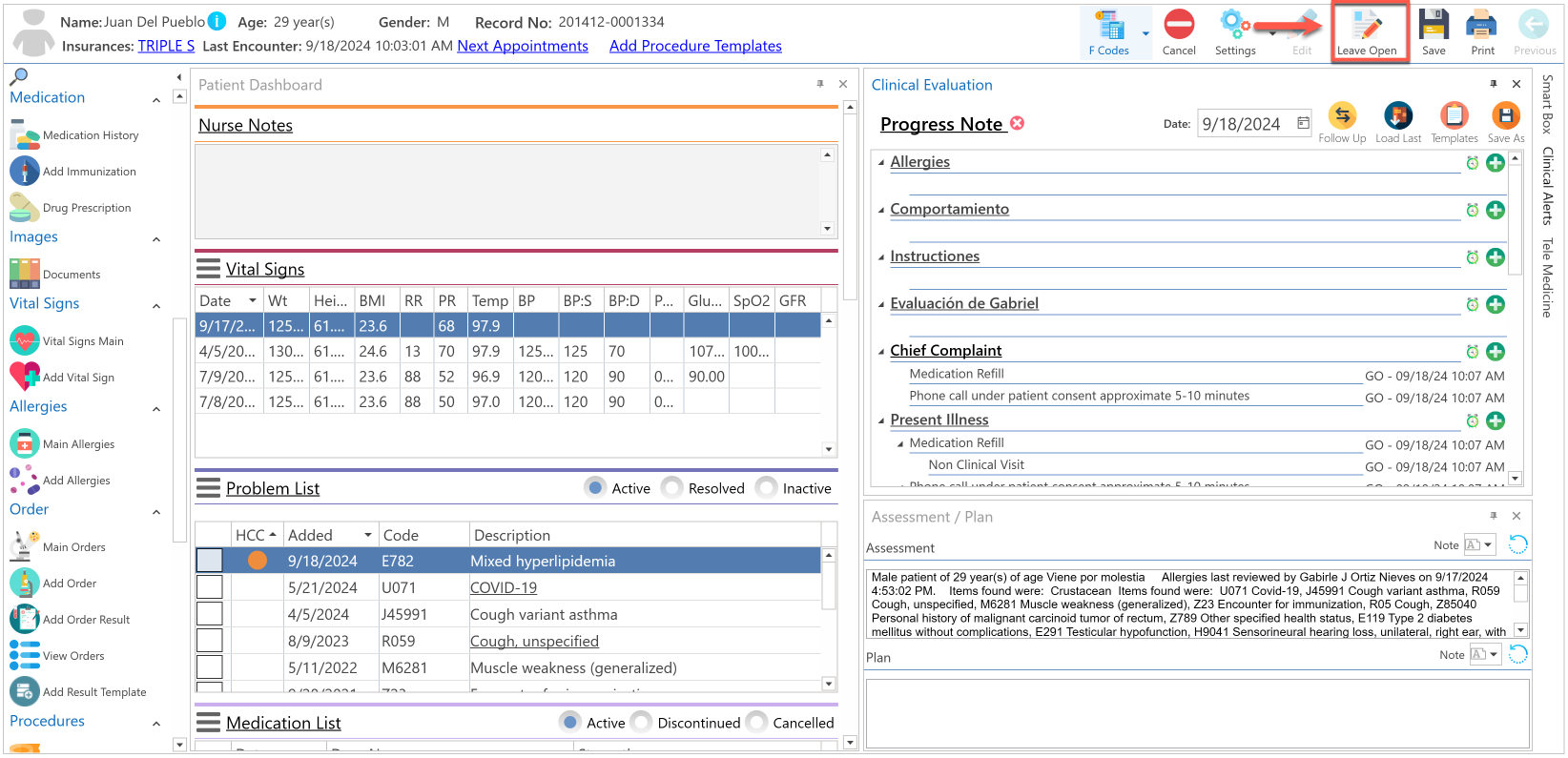 - Una vez el paciente es seleccionado, presione el botón de "Leave Open", localizado en la parte superior de la pantalla.