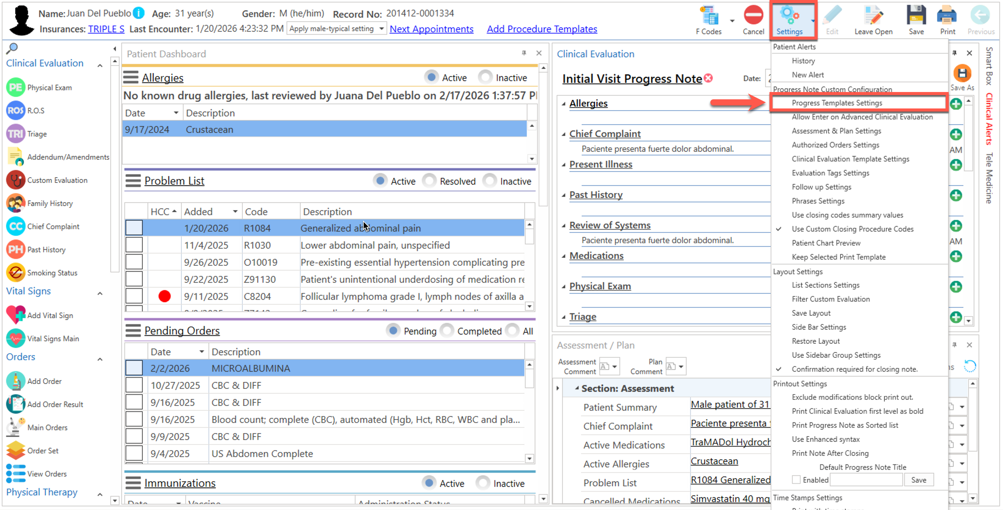 - Luego, seleccione la opción de "Progress Templates Settings", en la sección de "Progress Note Custom Configuration".
