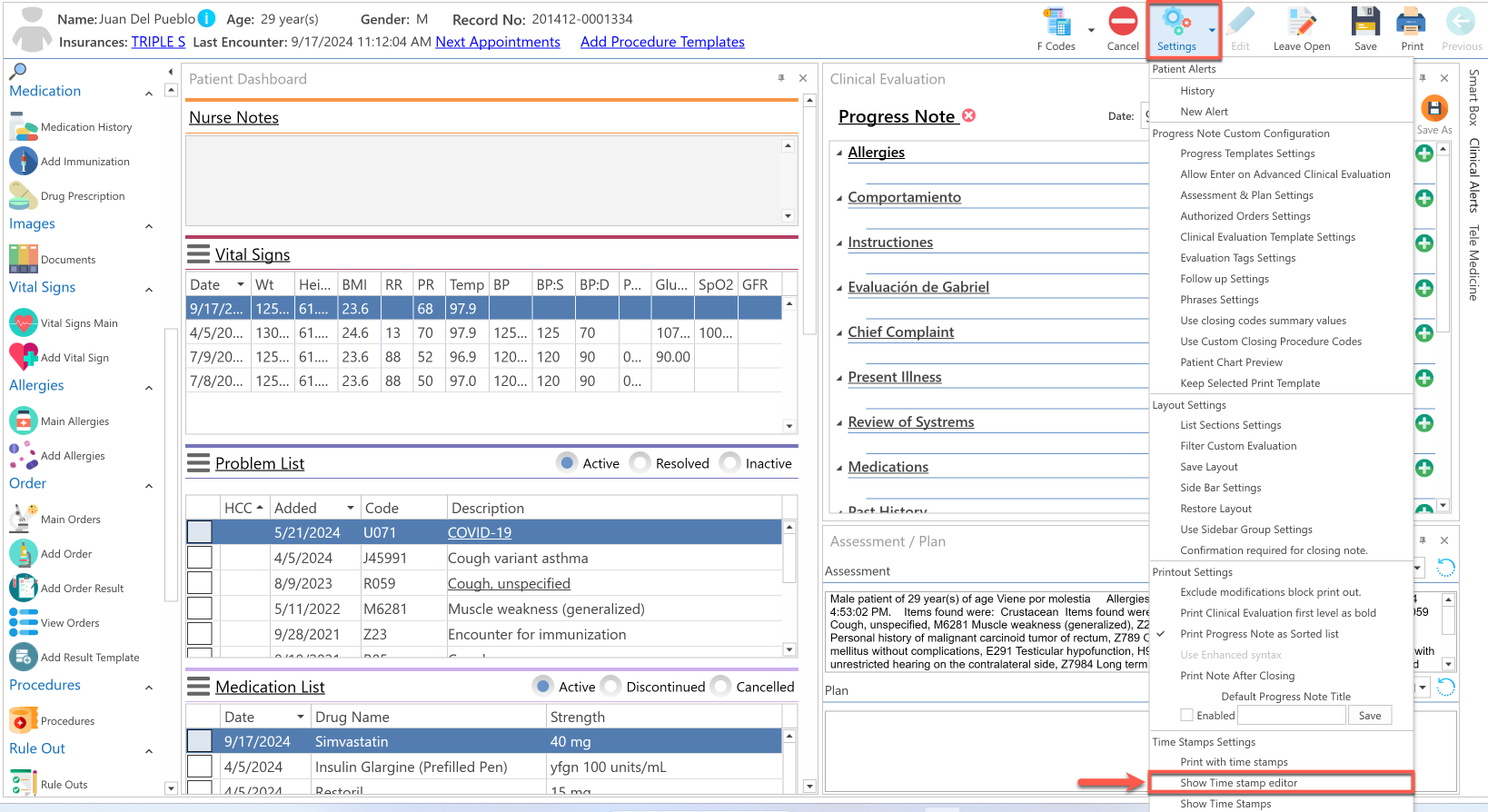 - Pantalla de "Advanced Progress Note", con la opción de "Show Time Stamp Editor" seleccionada.