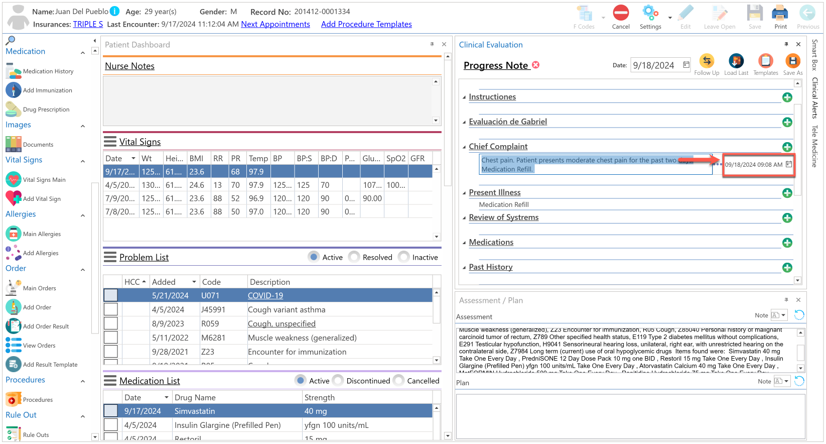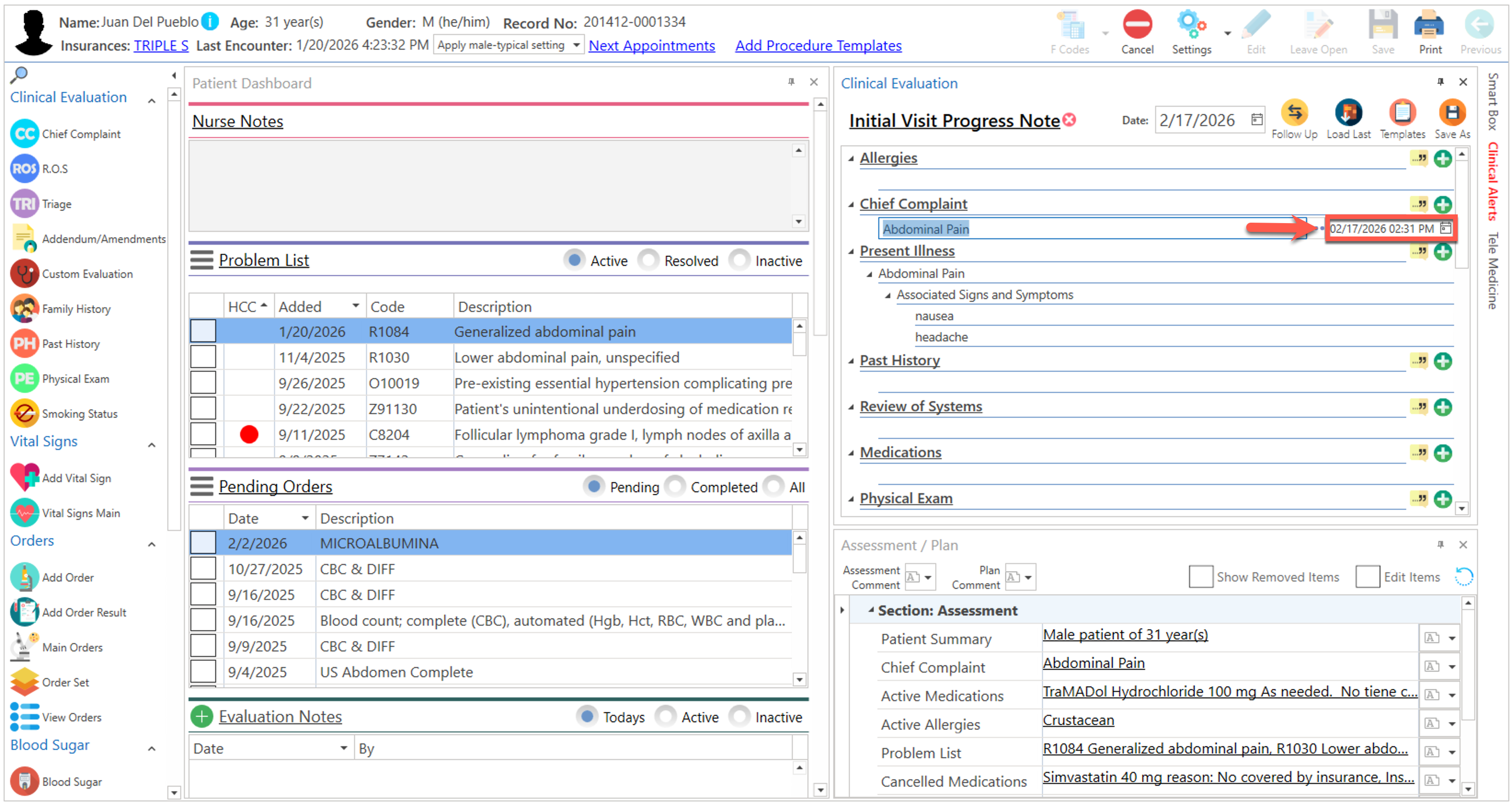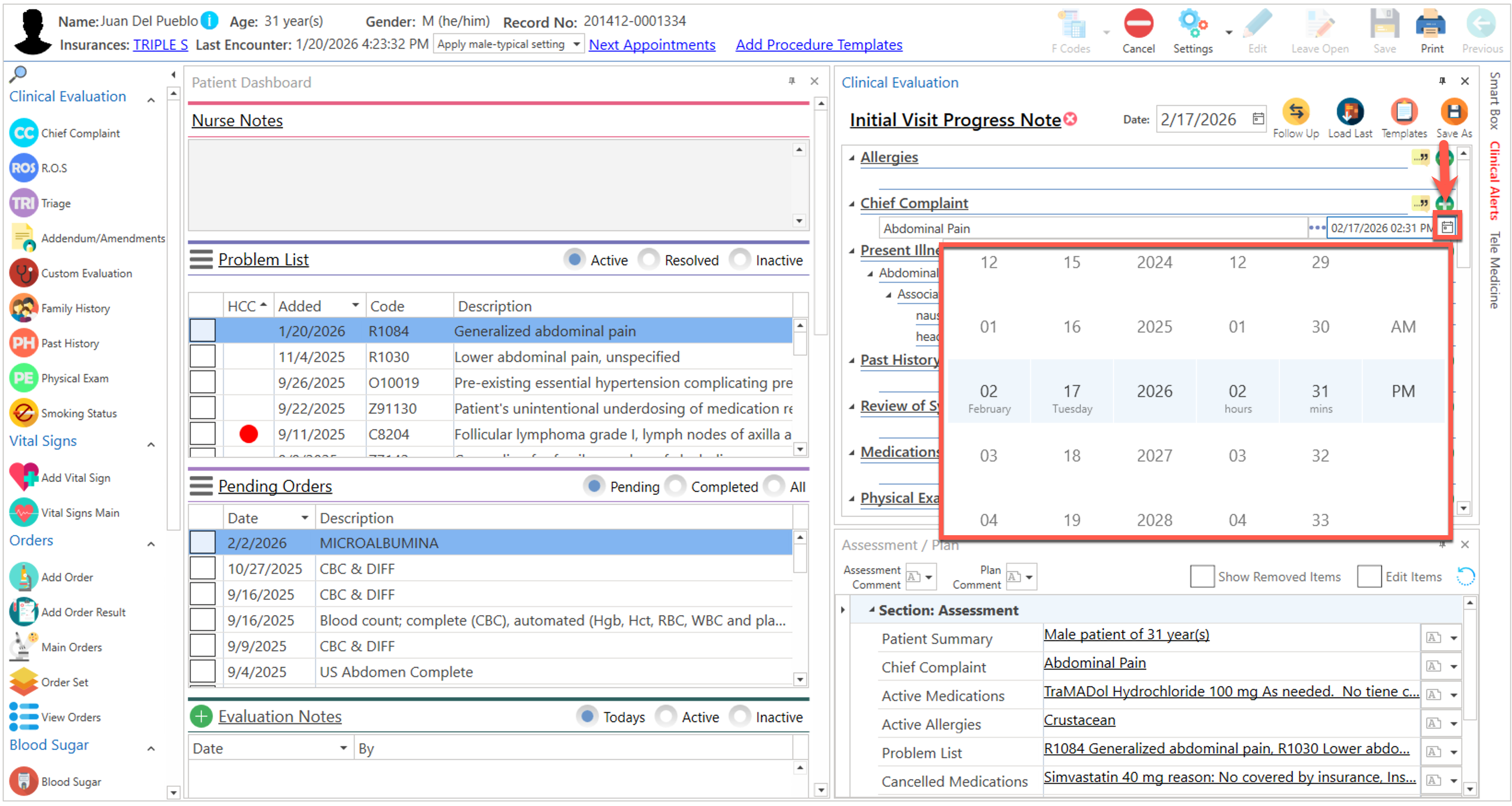 Esta opción, permite editar la fecha y hora de la evaluación del paciente, en la sección de "Clinical Evaluation".