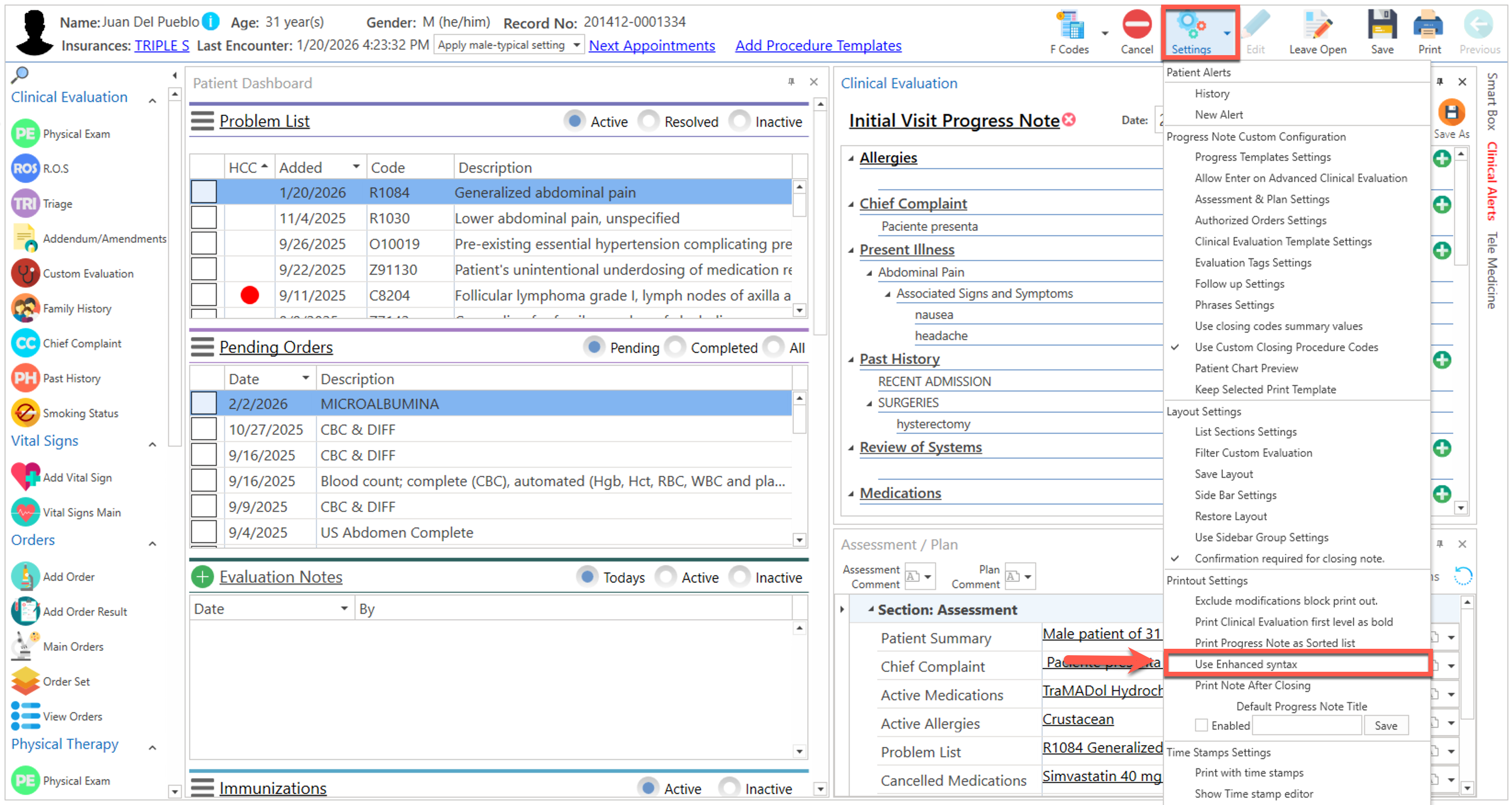 - Conociendo el área de: Advanced Progress Note / Settings / Use Enhanced Syntax