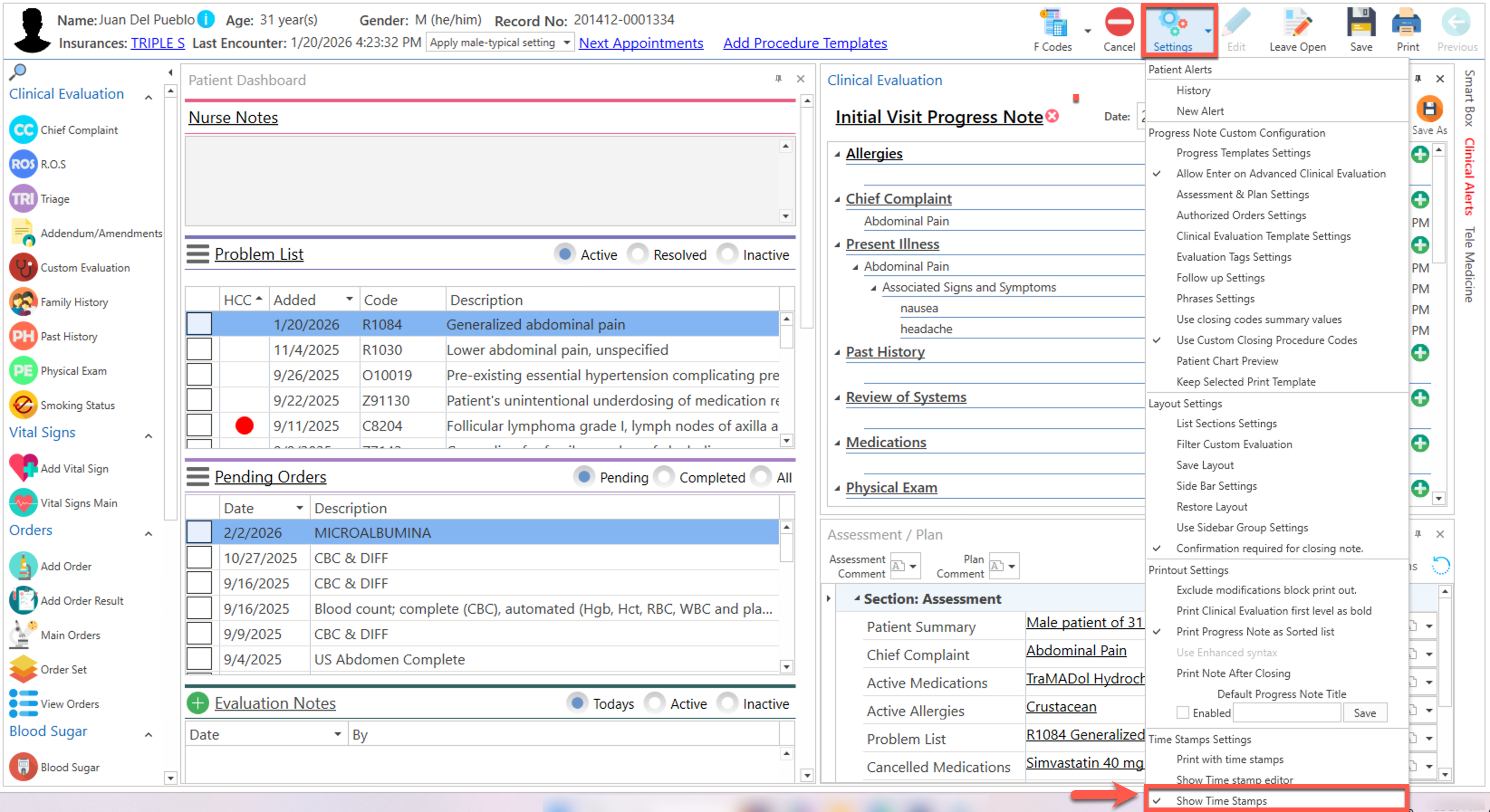 - Se desplegarán las iniciales del usuario y la fecha, en la que realizó la evaluación clínica del paciente, en la sección de "Clinical Evaluation".
