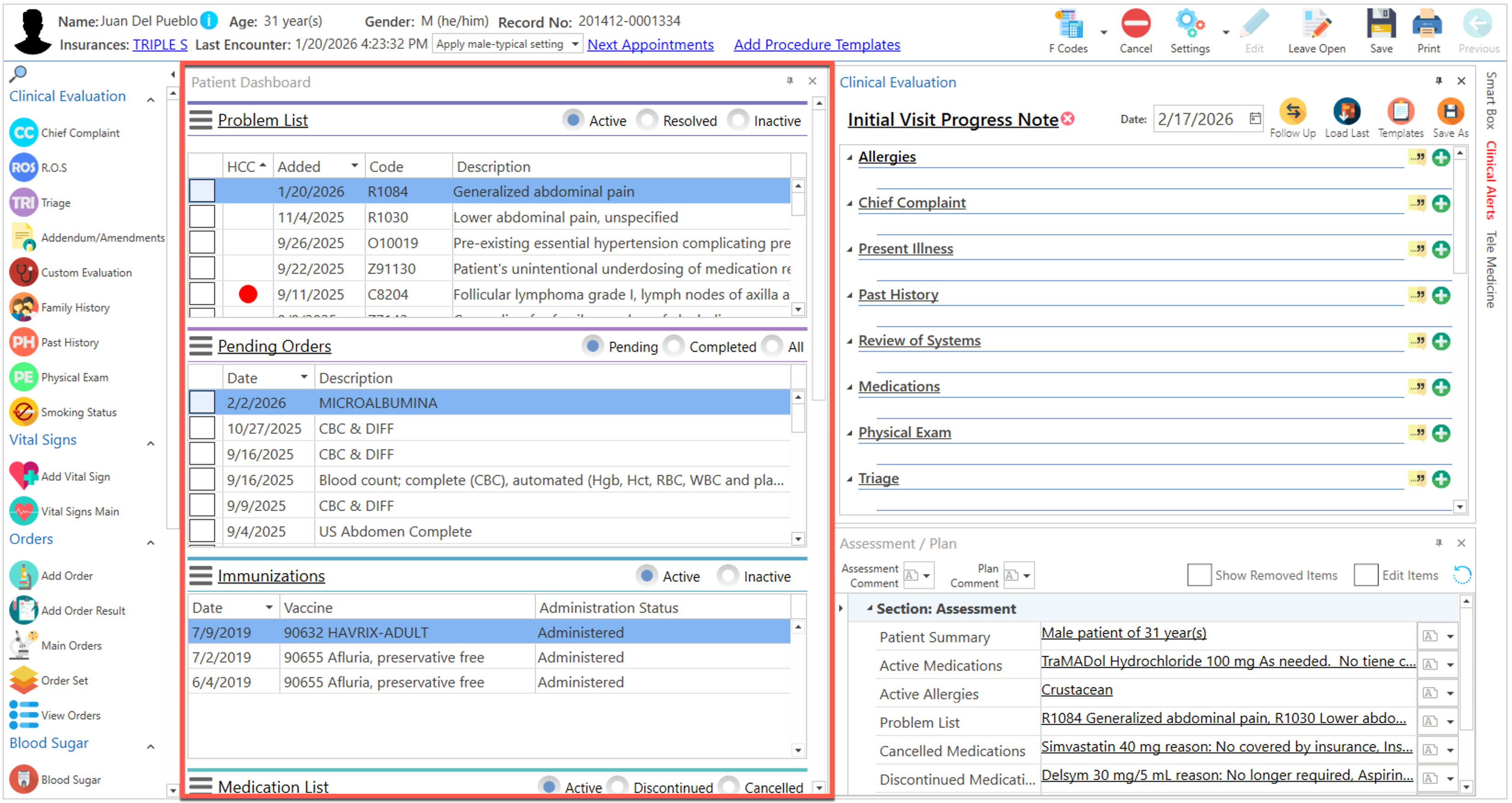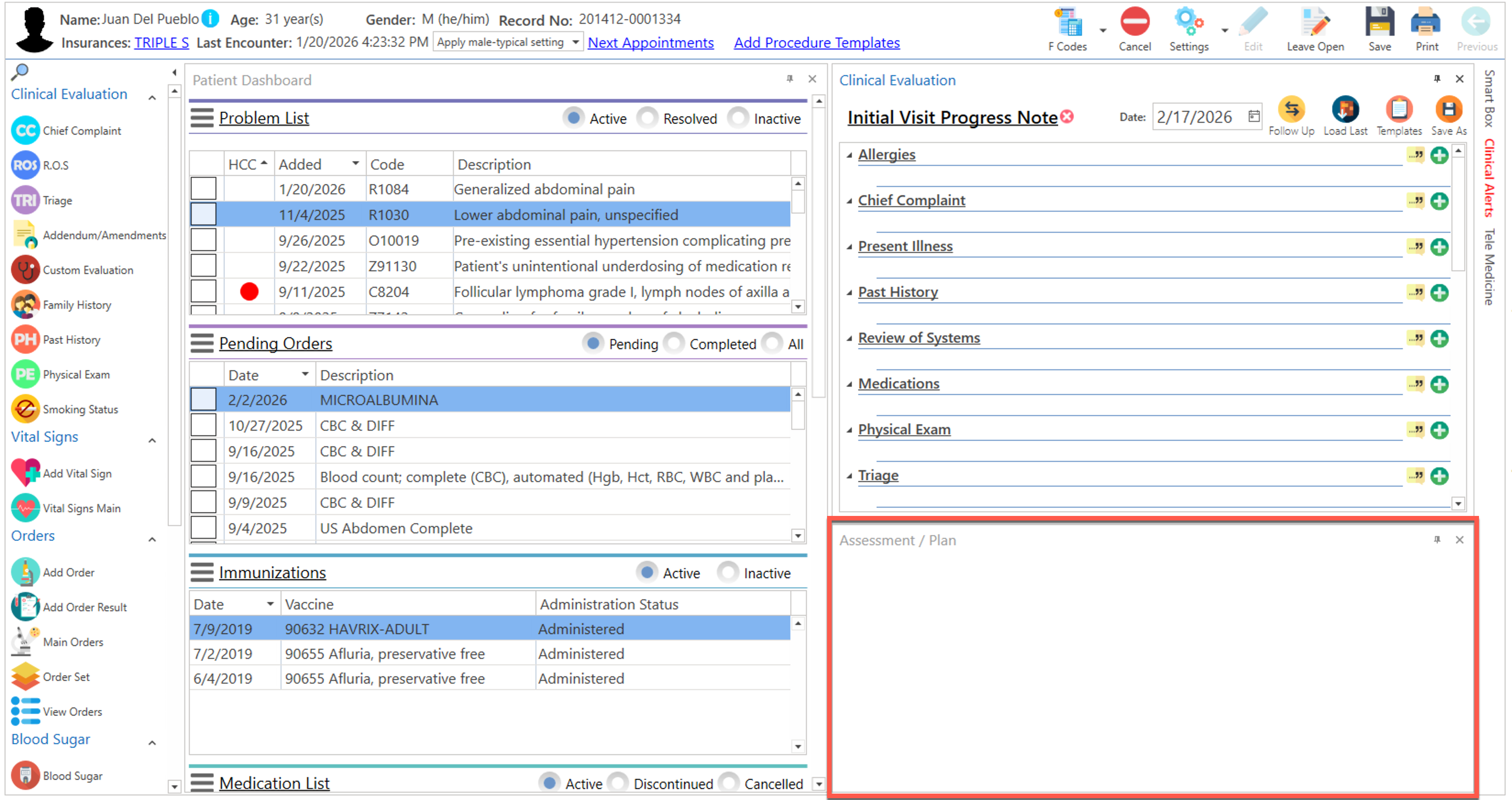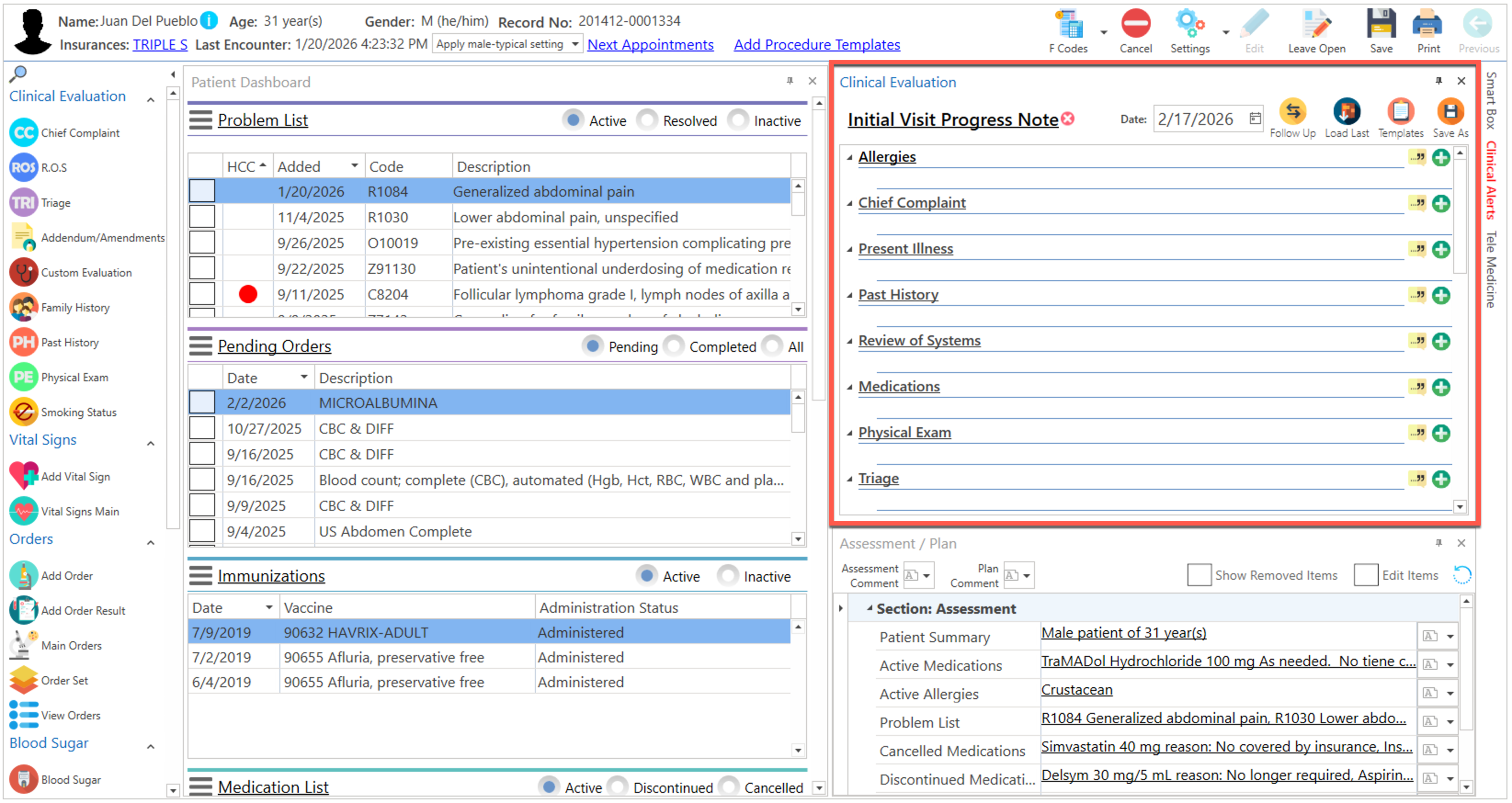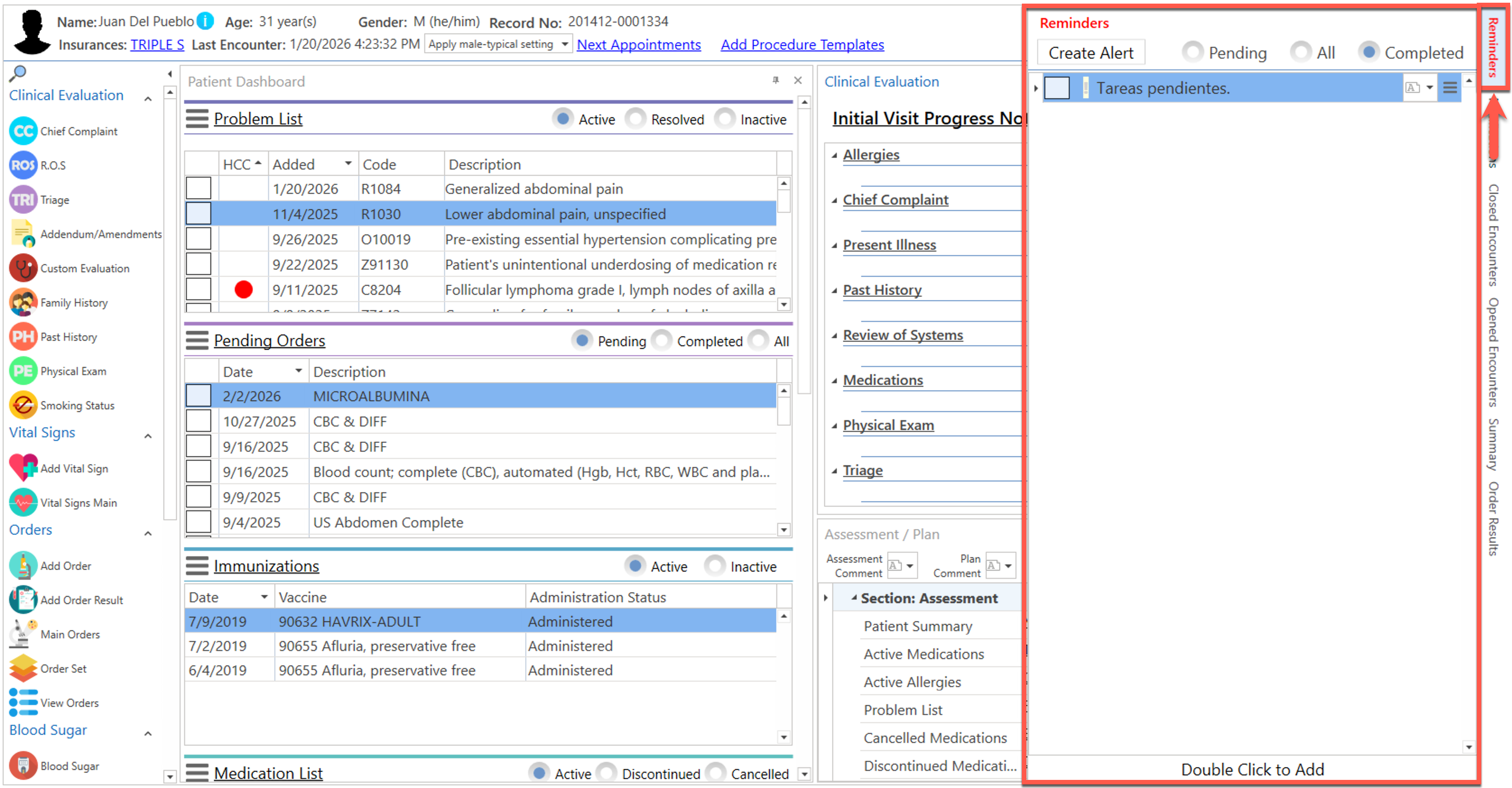 Pantalla principal donde el proveedor realiza la evaluación clínica del paciente. La misma podrá ser personalizada de acuerdo a la preferencia del usuario.