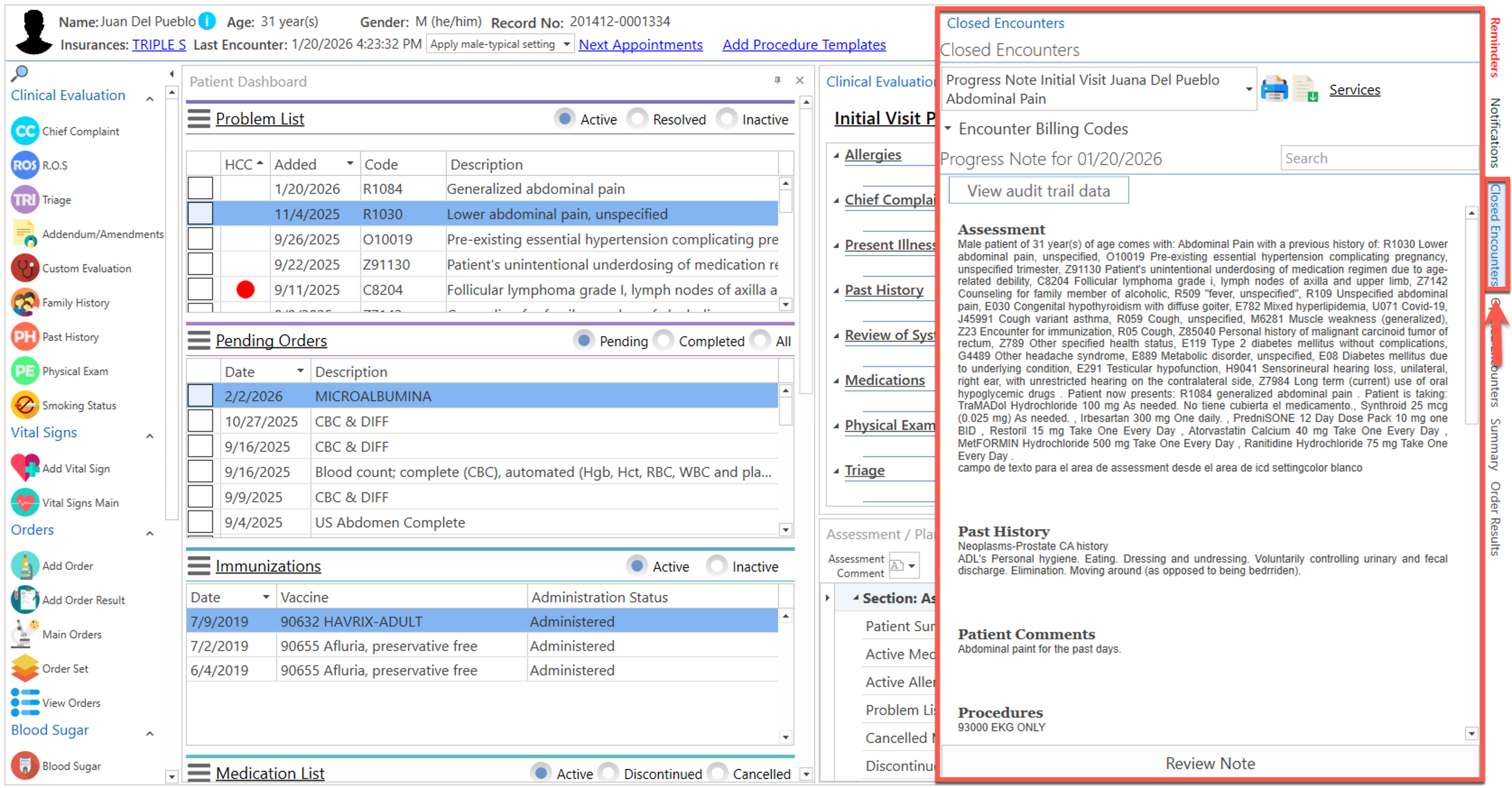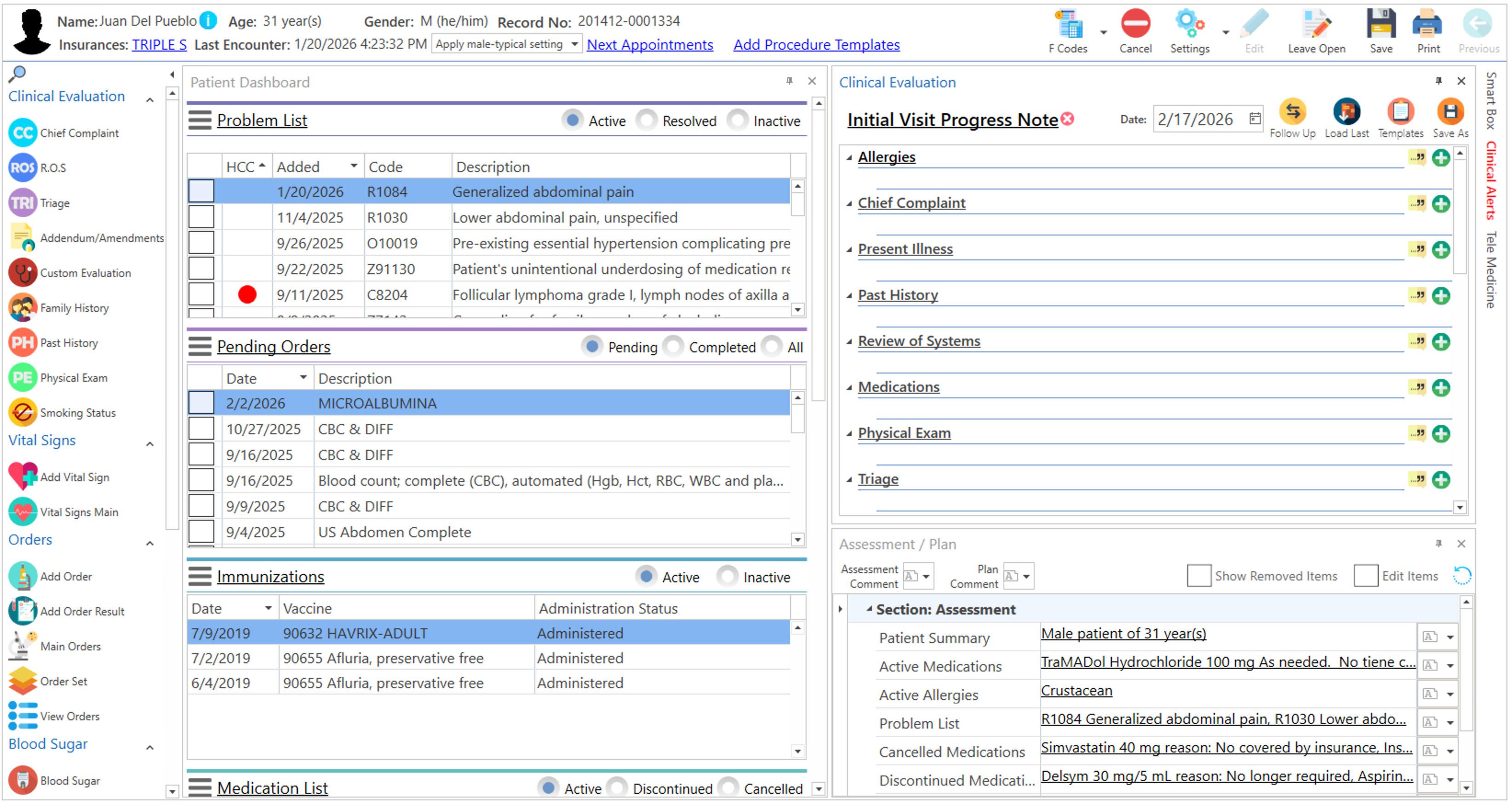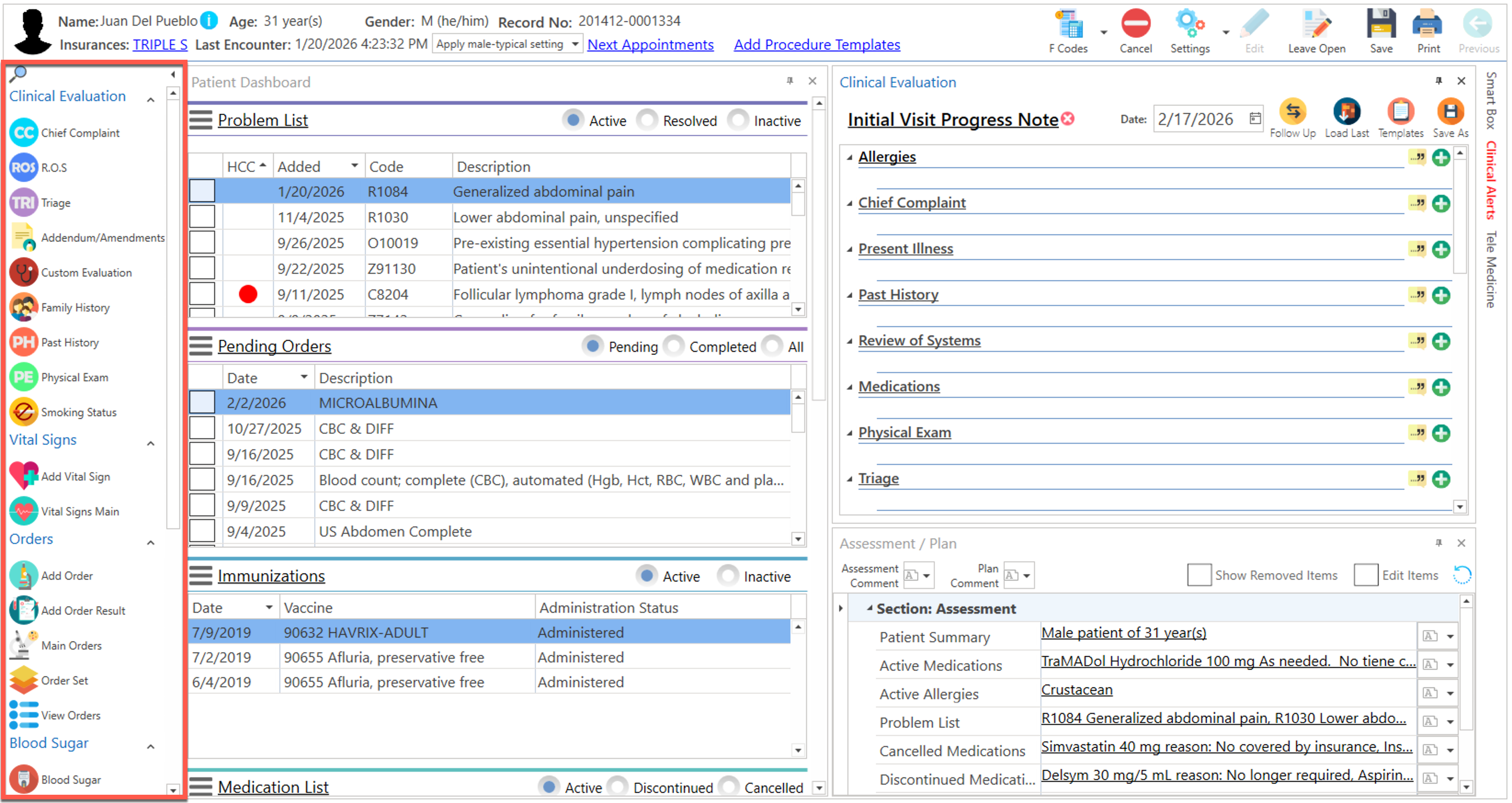 Pantalla principal donde el proveedor realiza la evaluación clínica del paciente. La misma podrá ser personalizada de acuerdo a la preferencia del usuario.