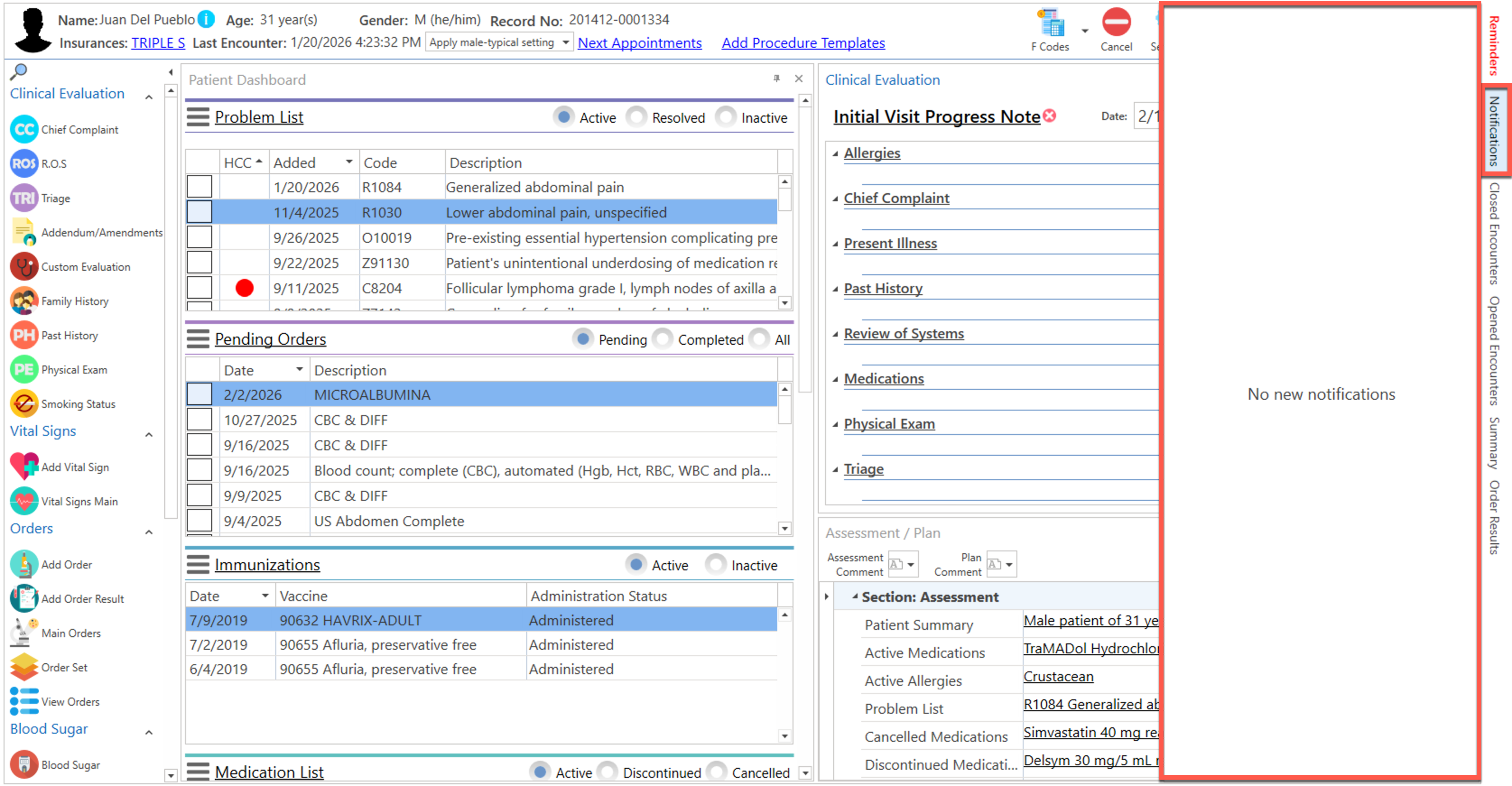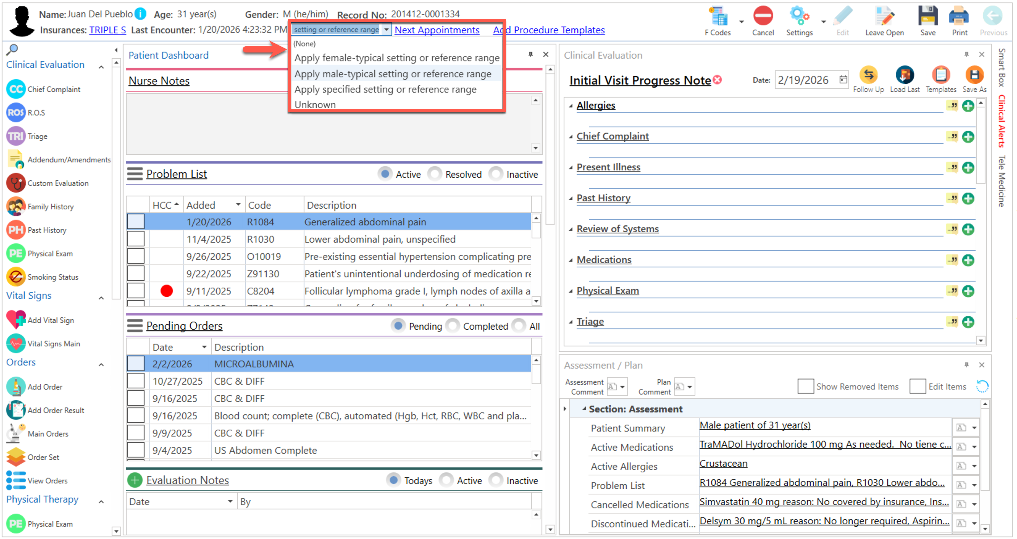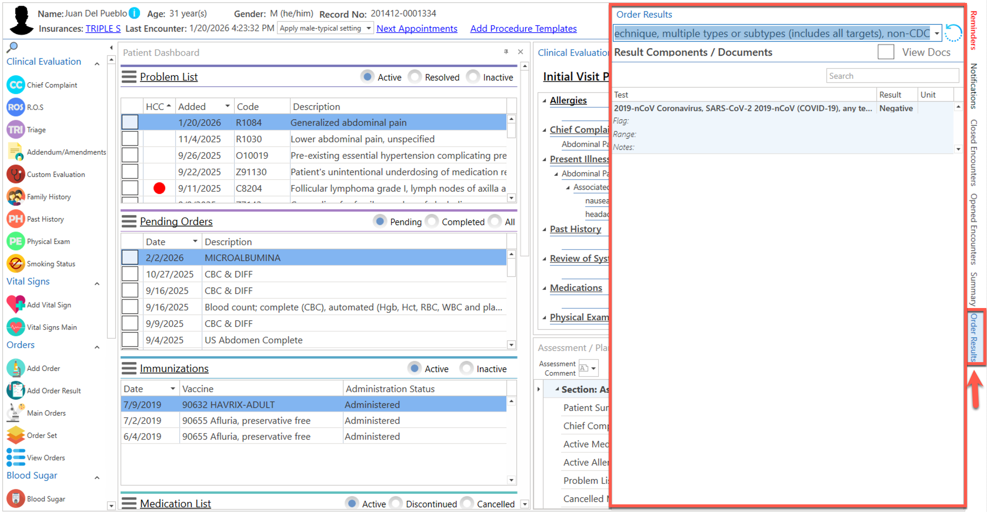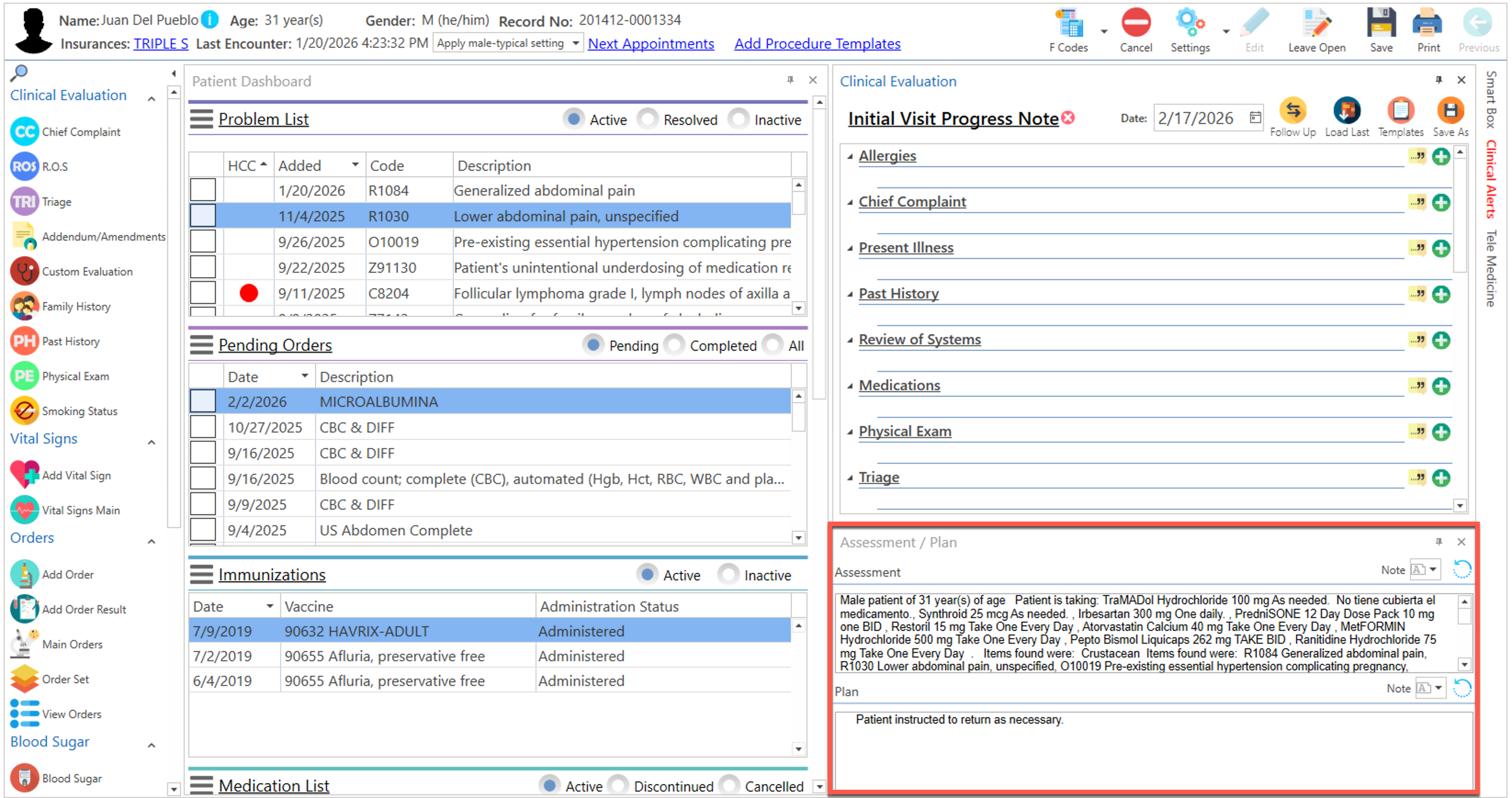 Pantalla principal donde el proveedor realiza la evaluación clínica del paciente. La misma podrá ser personalizada de acuerdo a la preferencia del usuario.