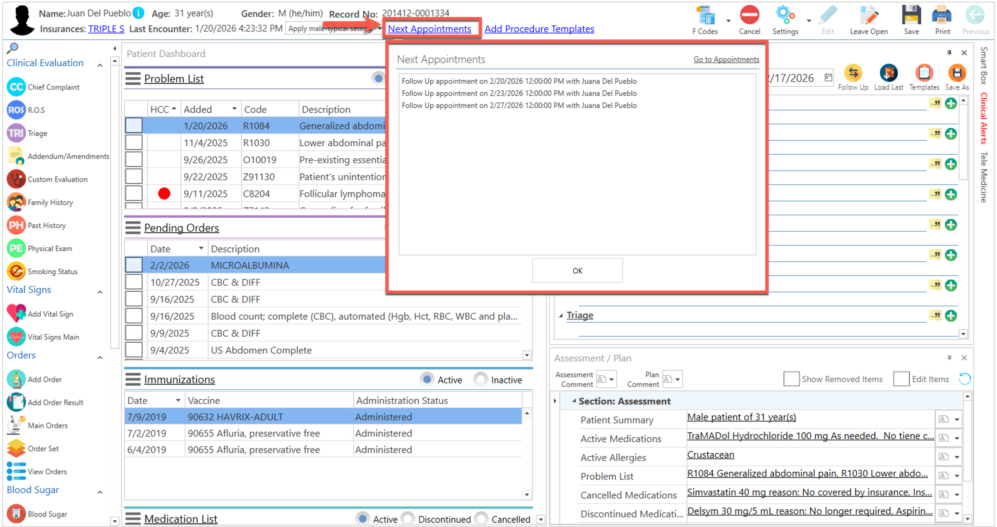 - Next Appointments: Al presionar sobre este enlace, se desplegarán las citas futuras del paciente seleccionado. El usuario podrá crear citas desde la misma nota de progreso, a través del enlace de "Go to Appointments".