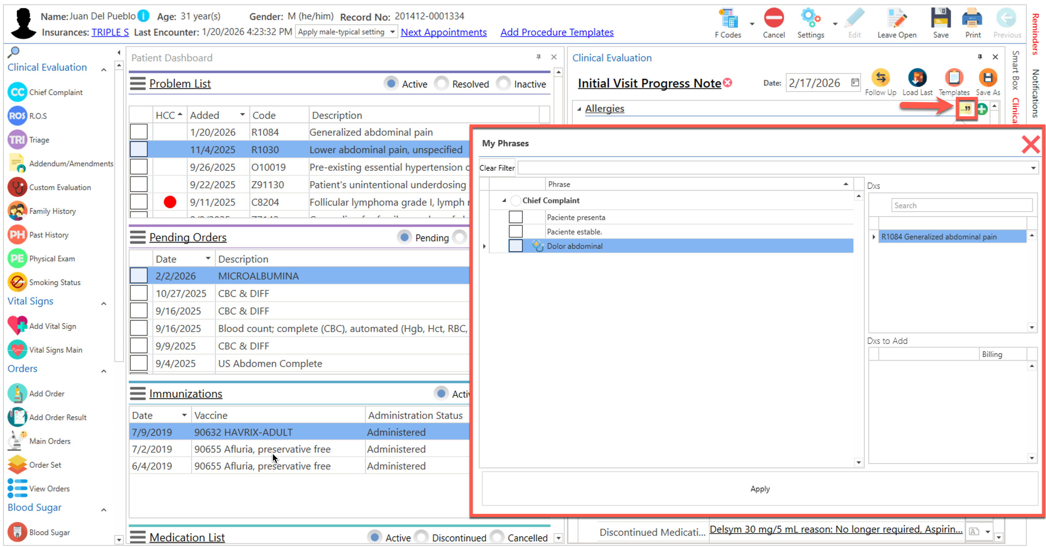 - My Phrases: Sección para documentar la evaluación clínica del paciente, através de frases, previamente configuradas en la sección de "Settings / Phrases Settings".