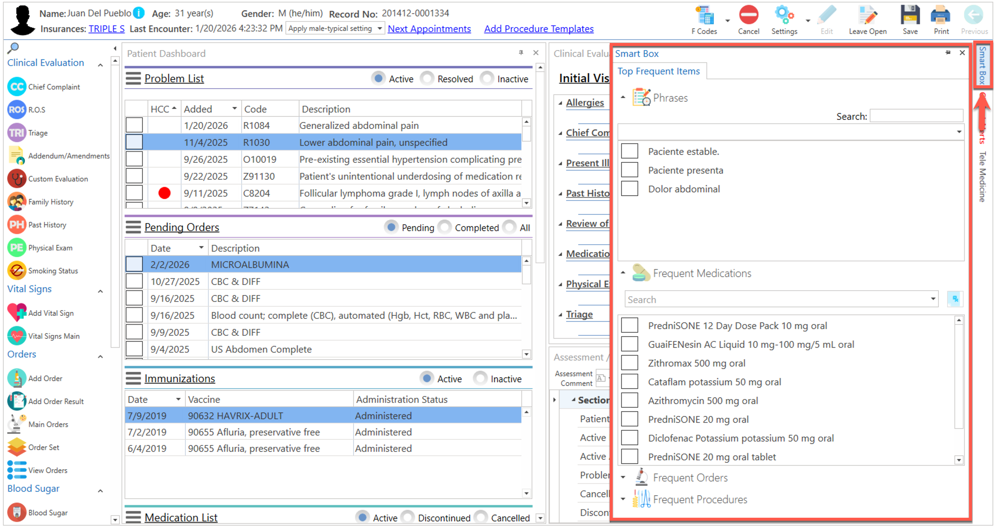 - Pestaña [Smart Box]: Pantalla donde el usuario podrá seleccionar las frases, medicamentos, órdenes y procedimientos frecuentes.