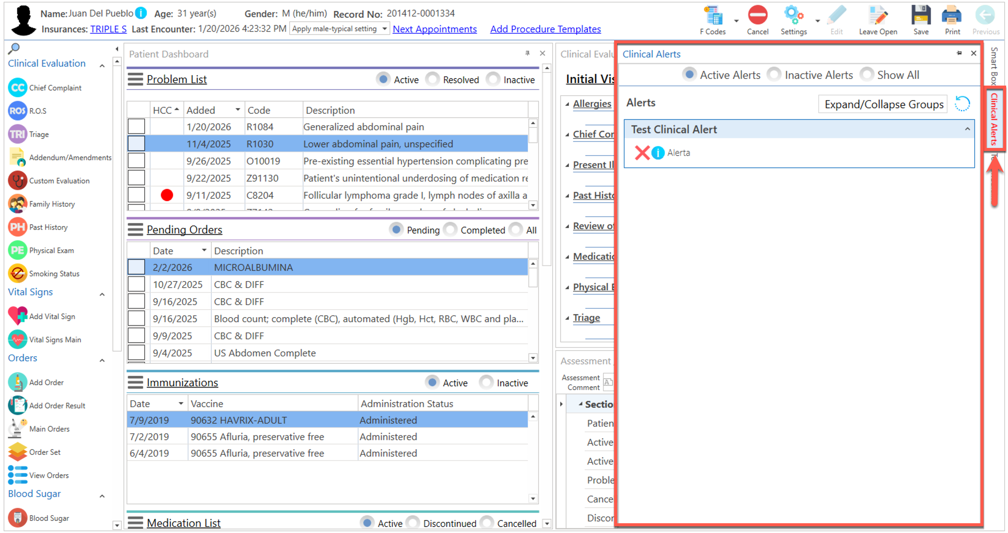 - Clinical Alerts: Al presionar, muestra las alertas clínicas del paciente.