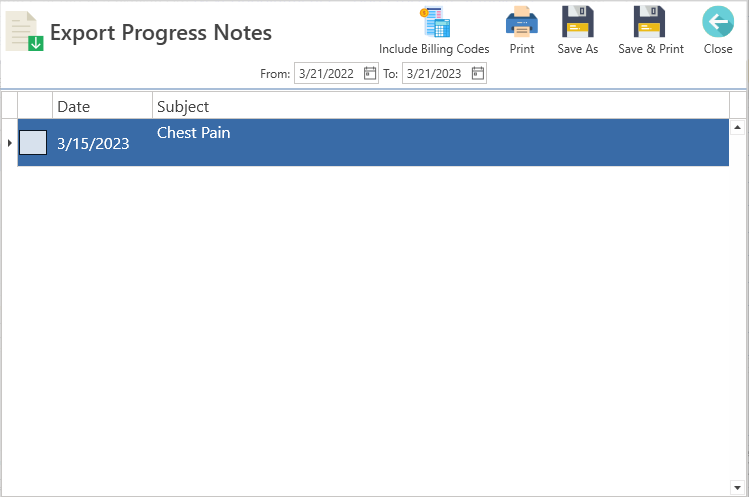 • O presione el botón de"Search", localizado en la parte superior izquierda de la pantalla y seleccione el botón de "Export Progress Notes".