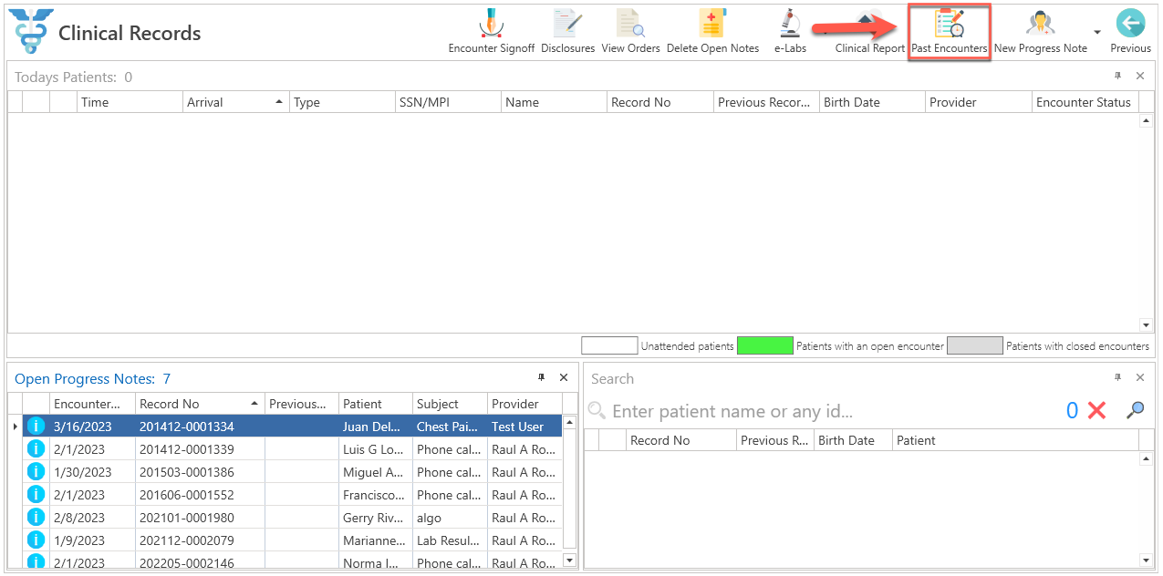 • Seleccione el paciente desde cualquier sección de la pantalla. Una vez seleccionado, presione el botón de "Past Encounters" localizado en la parte superior de la pantalla.