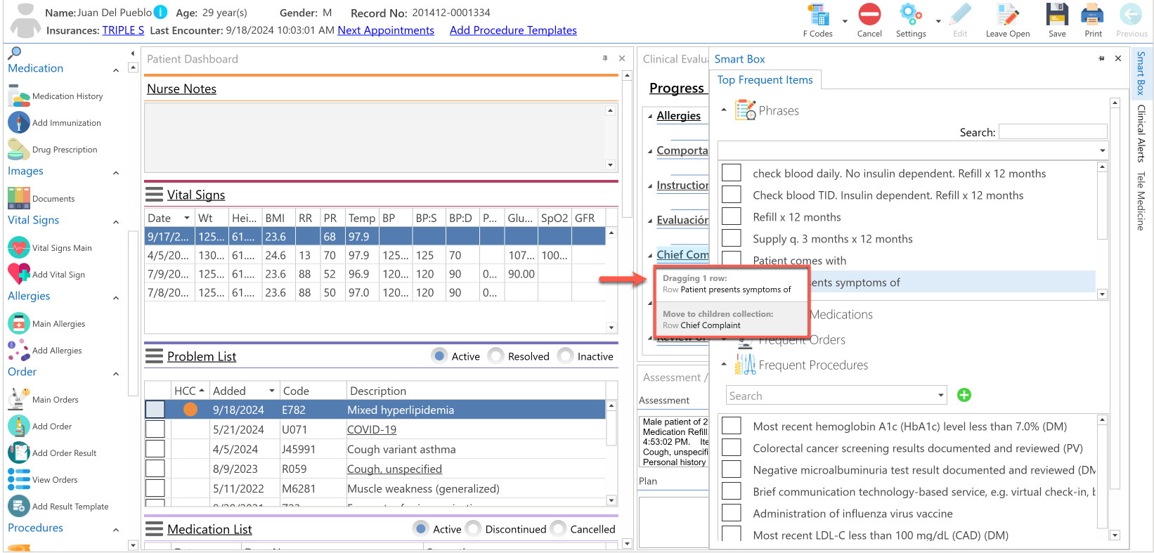 - Seleccione una frase, luego de seleccionada, arrastre hacia la sección de "Clinical Evaluation".