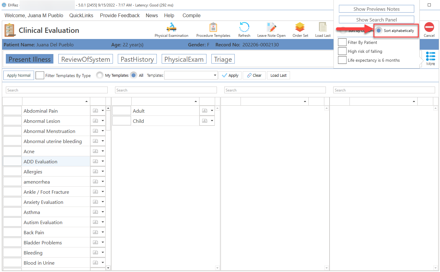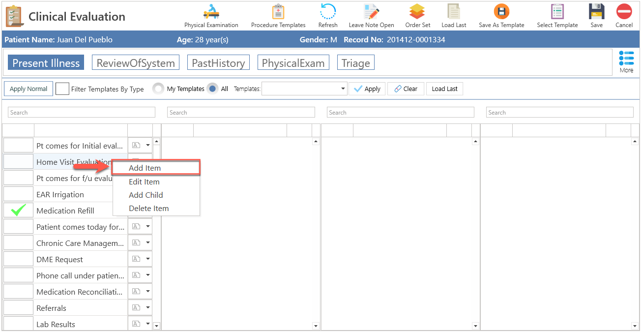 - En la primera columna que se despliega en la pestaña de "Present Illness", presione el botón derecho del "mouse".